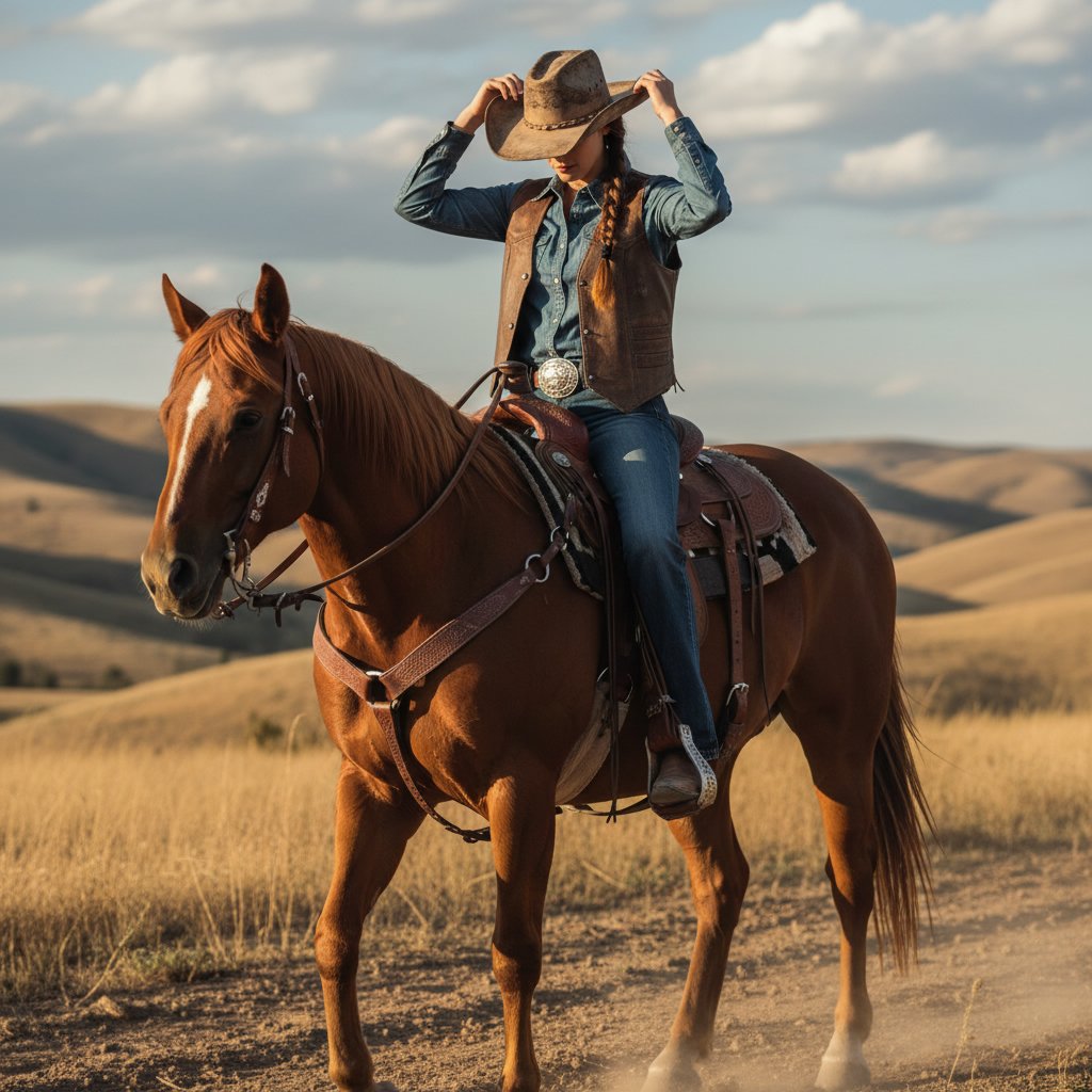 Soft, cascading waves peek out from under a cowboy hat, adding a touch of femininity to the rugged rodeo look.