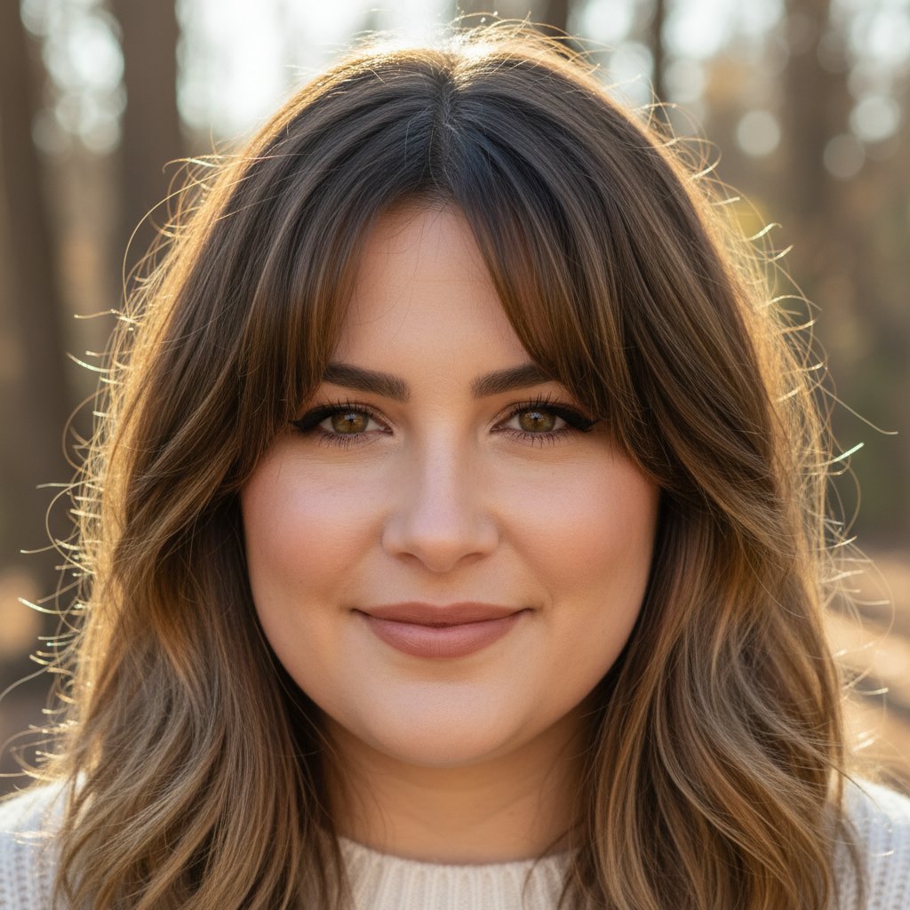 Wispy bangs paired with a layered cut add texture and dimension, ideal for breaking up the roundness of the face.