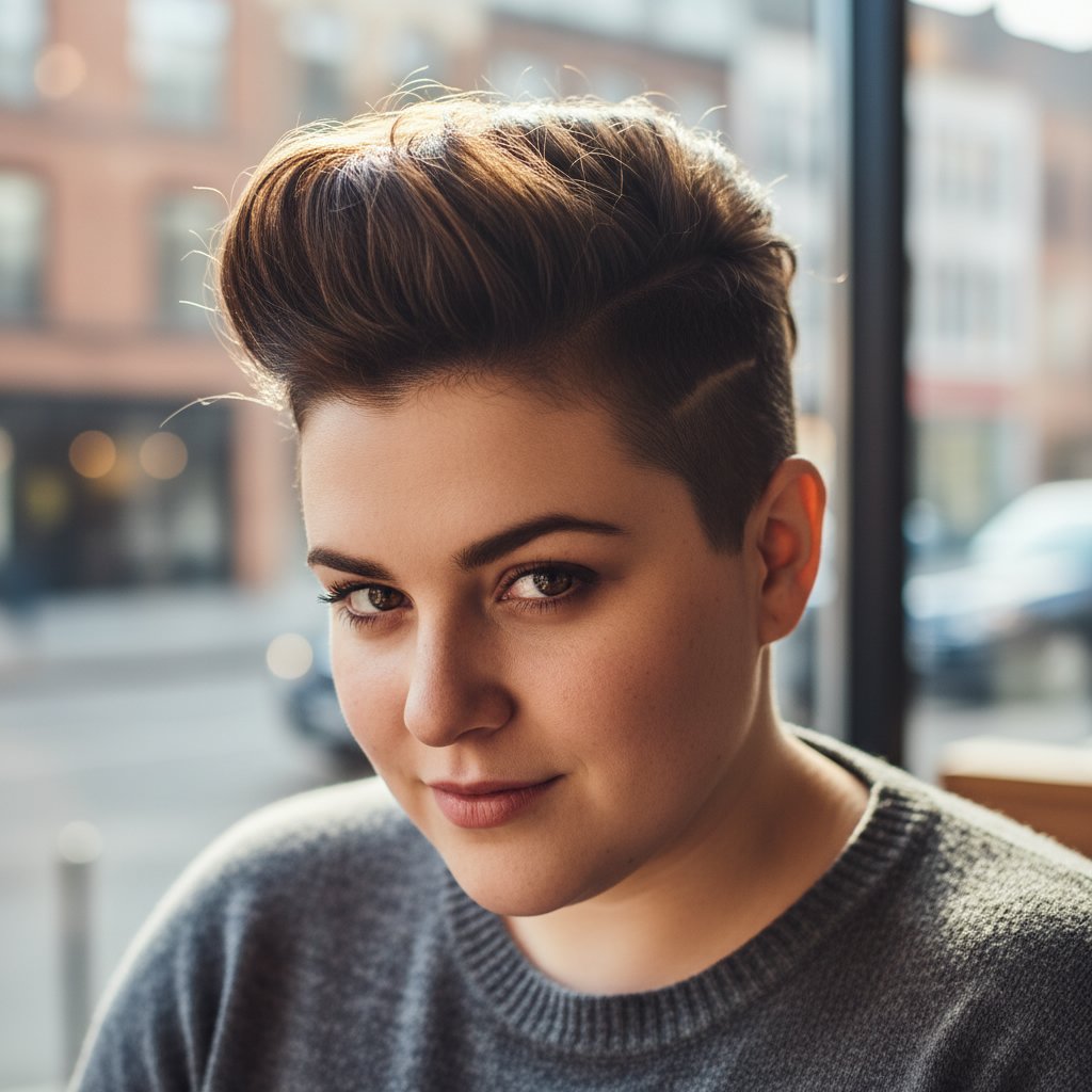 An undercut paired with a pompadour adds height to the top of the head, balancing out round face features effectively.