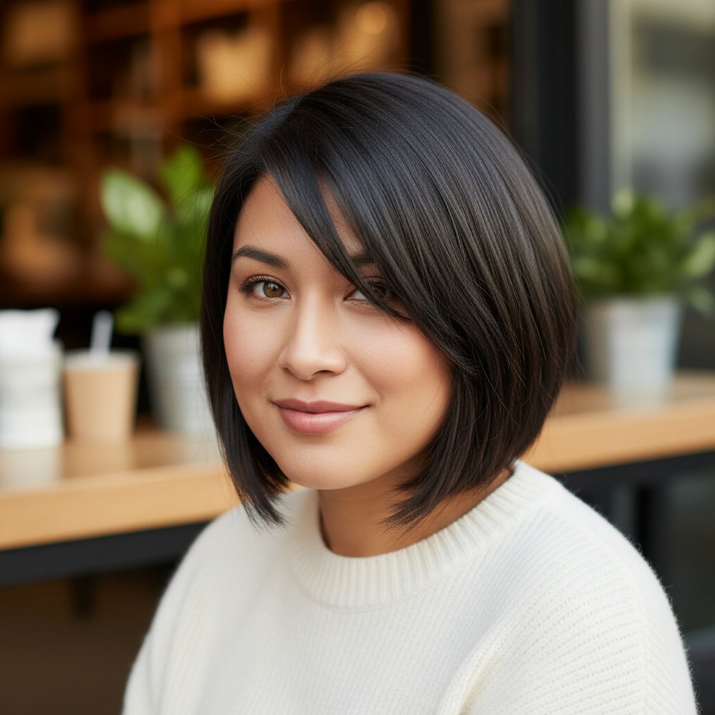 An asymmetrical bob introduces angles and structure, making it an ideal choice for softening the roundness of the face.