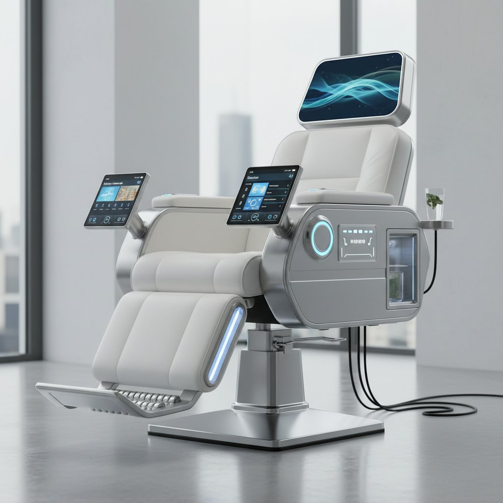 A high-tech salon chair equipped with digital features for enhanced client experiences, such as adjustable settings and built-in charging ports.