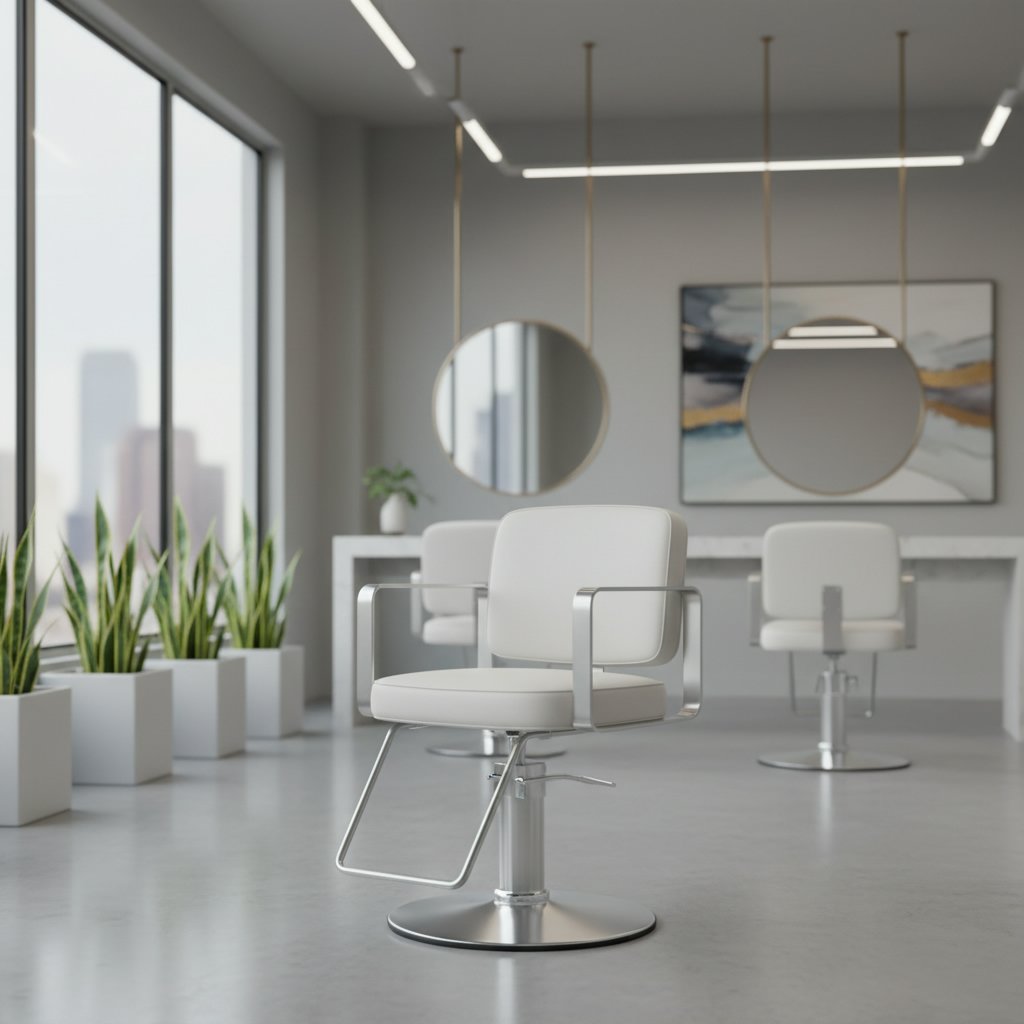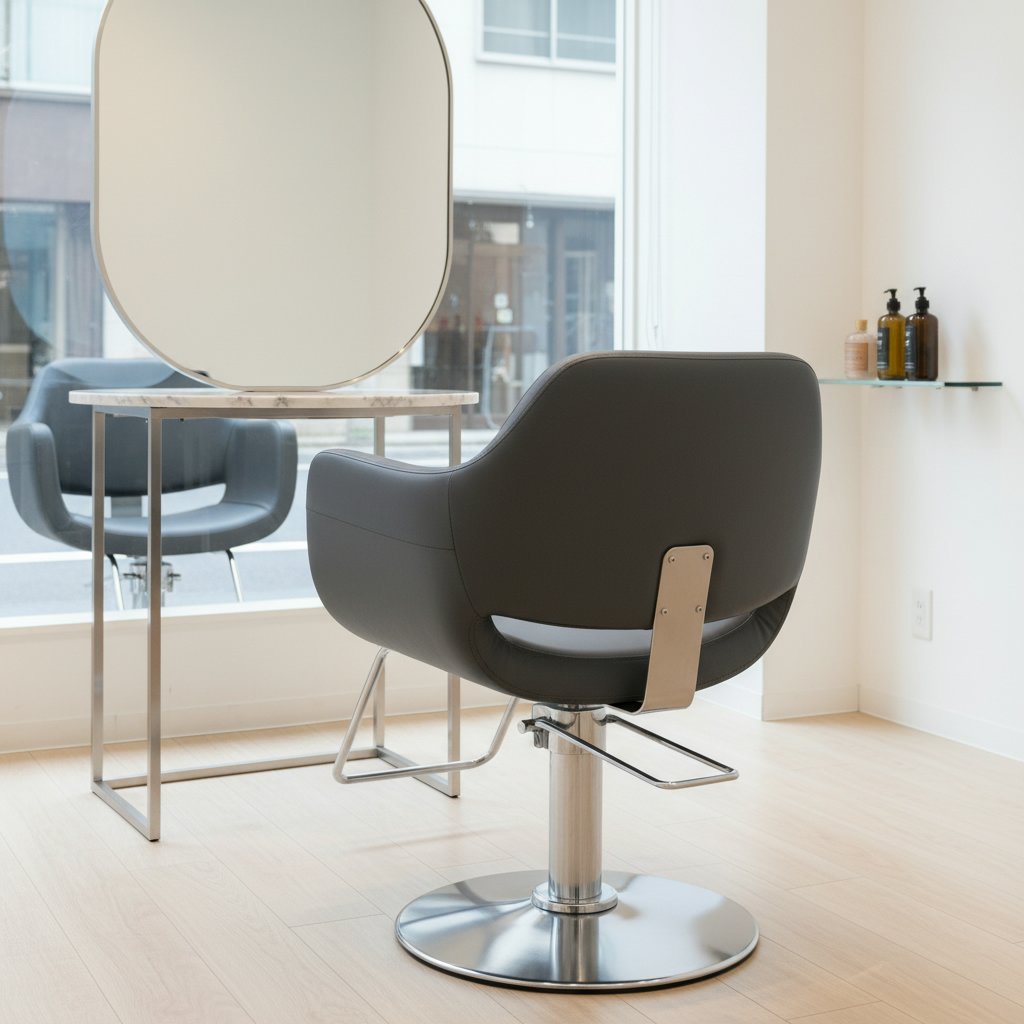 Featuring a sleek, hydraulic salon chair that offers both style and versatility, with smooth height adjustment for client comfort.