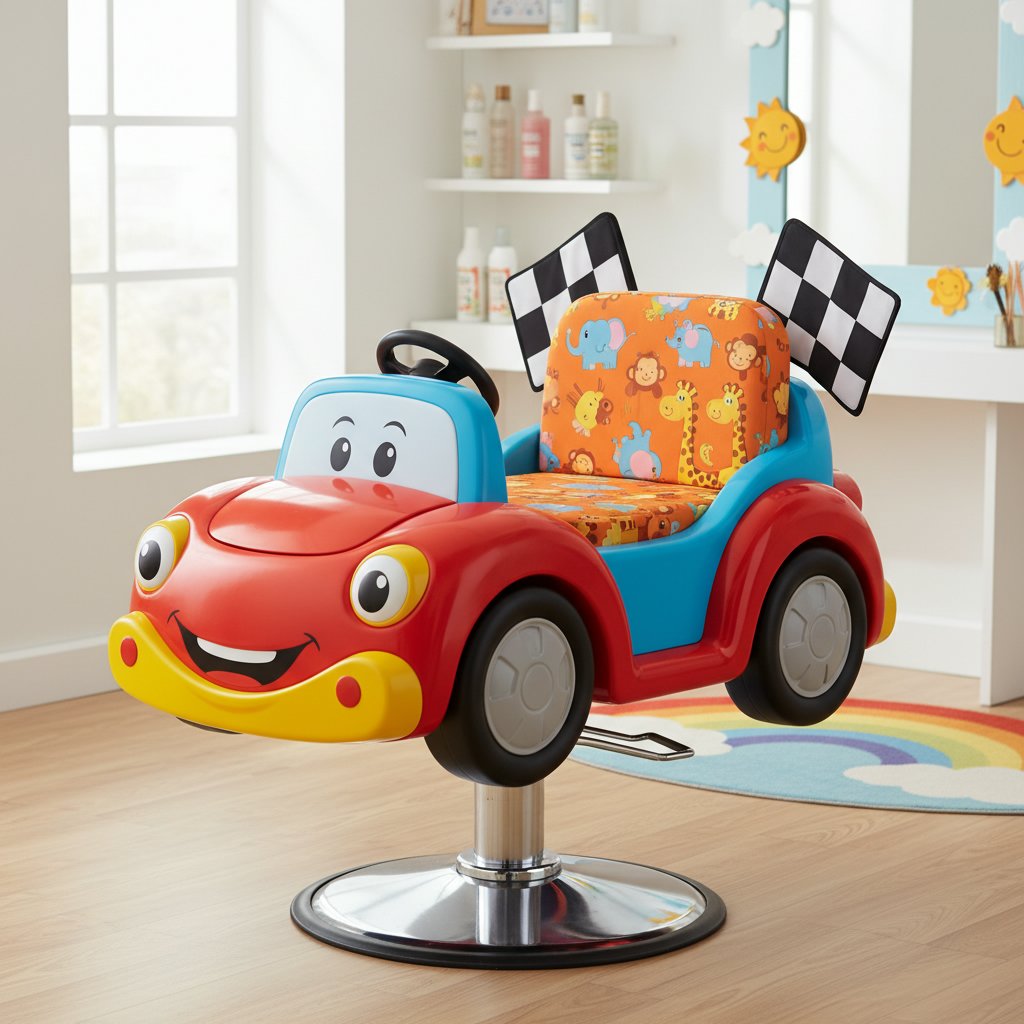 A child-friendly salon chair designed to make younger clients feel at ease, featuring fun shapes and vibrant colors.
