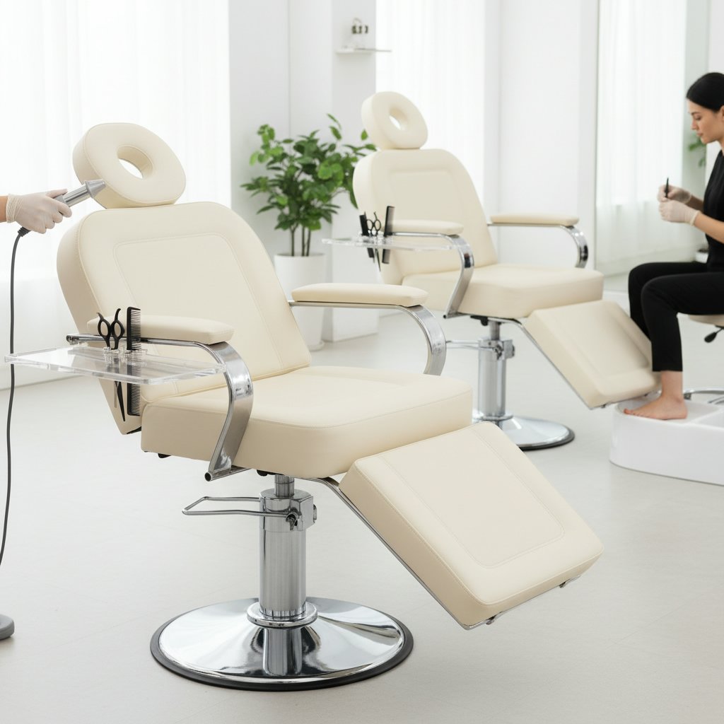 An all-purpose salon chair with adjustable features, catering to a wide range of salon services from cutting to shampooing.
