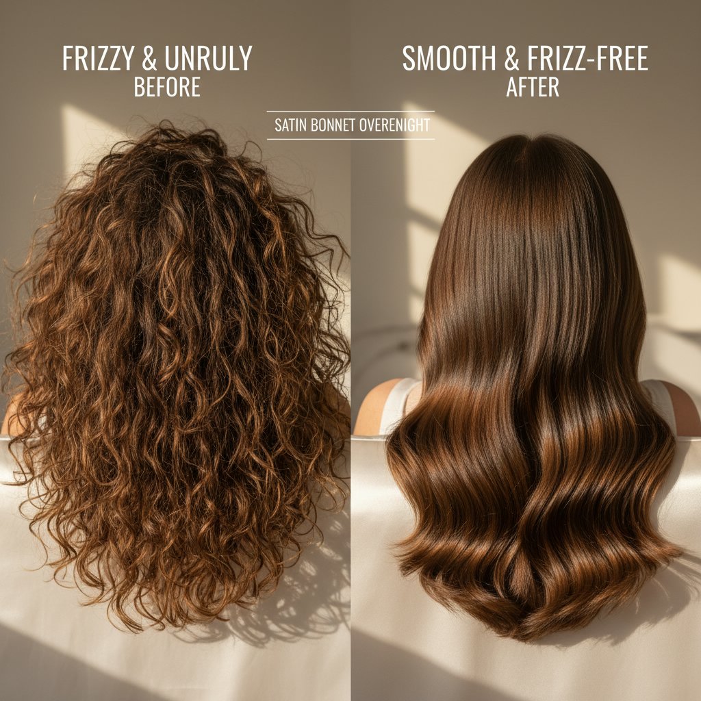 Before: Frizzy, unruly morning hair. After: Smooth, frizz-free hair, thanks to the satin bonnet's friction-less surface.