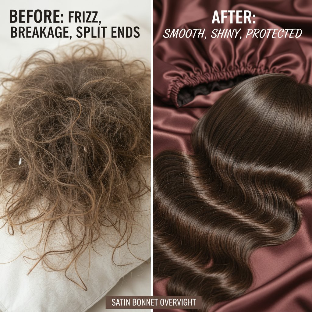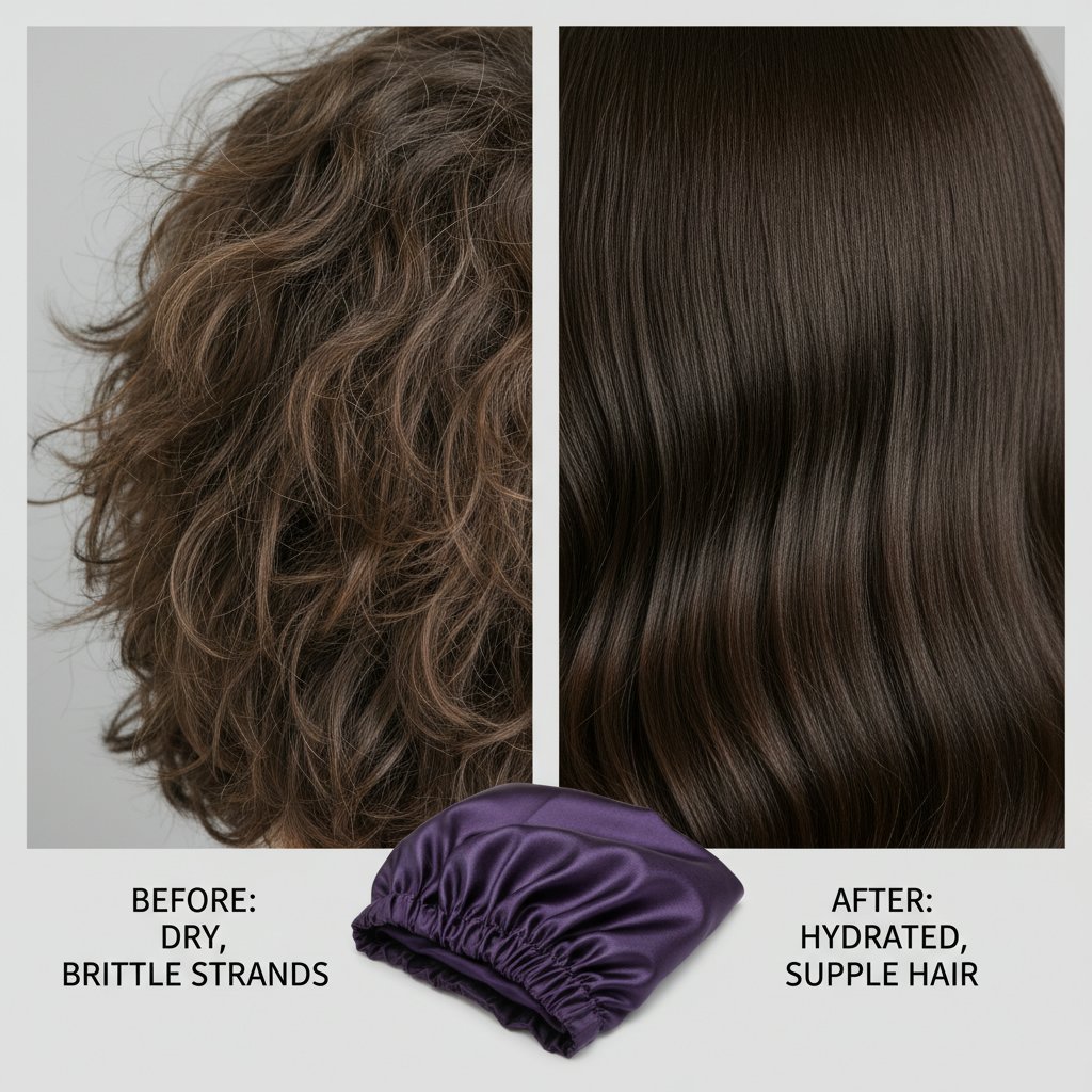 Before: Dry, brittle strands. After: Hydrated, supple hair, showcasing the moisture-retaining properties of satin.