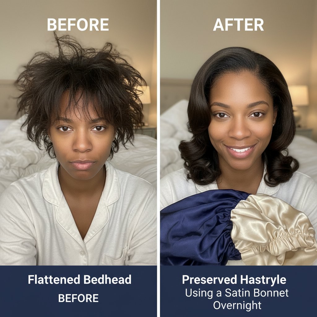 Before: Flattened, bedhead look. After: Preserved hairstyle, demonstrating satin bonnet's ability to maintain hair's shape.