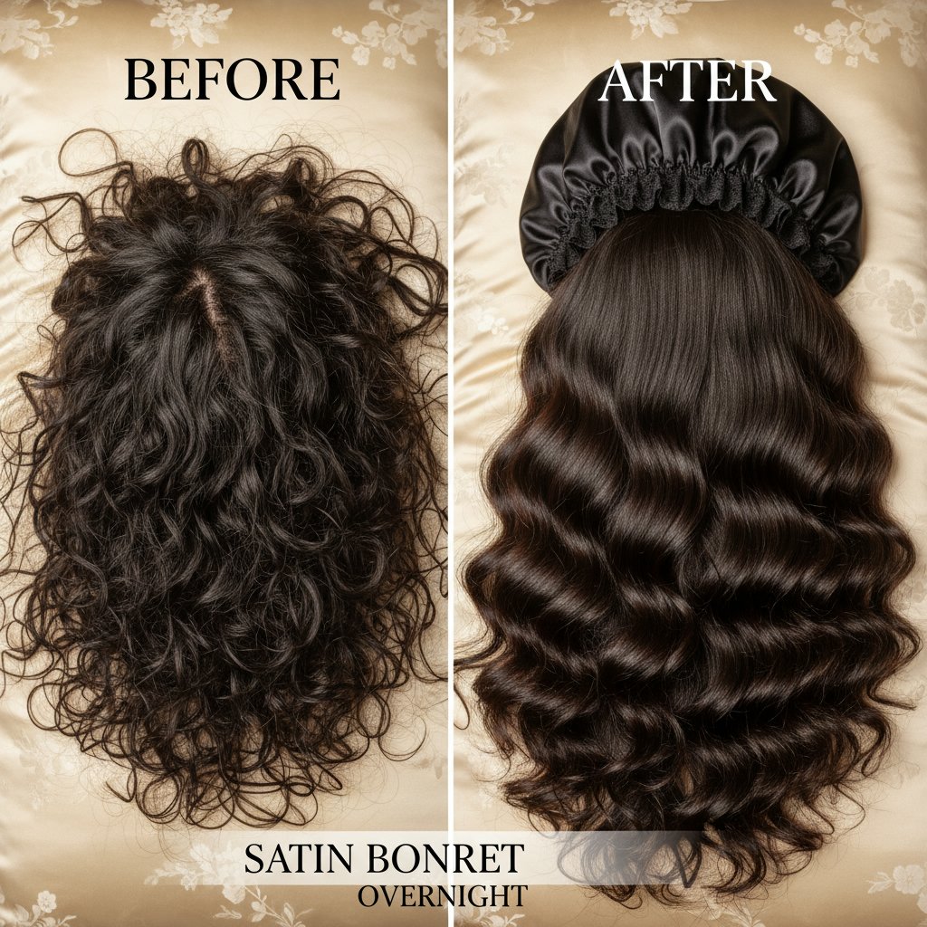 Before: Tangled, knotted hair. After: Tangle-free, smooth locks, highlighting the satin bonnet's role in preventing knots.