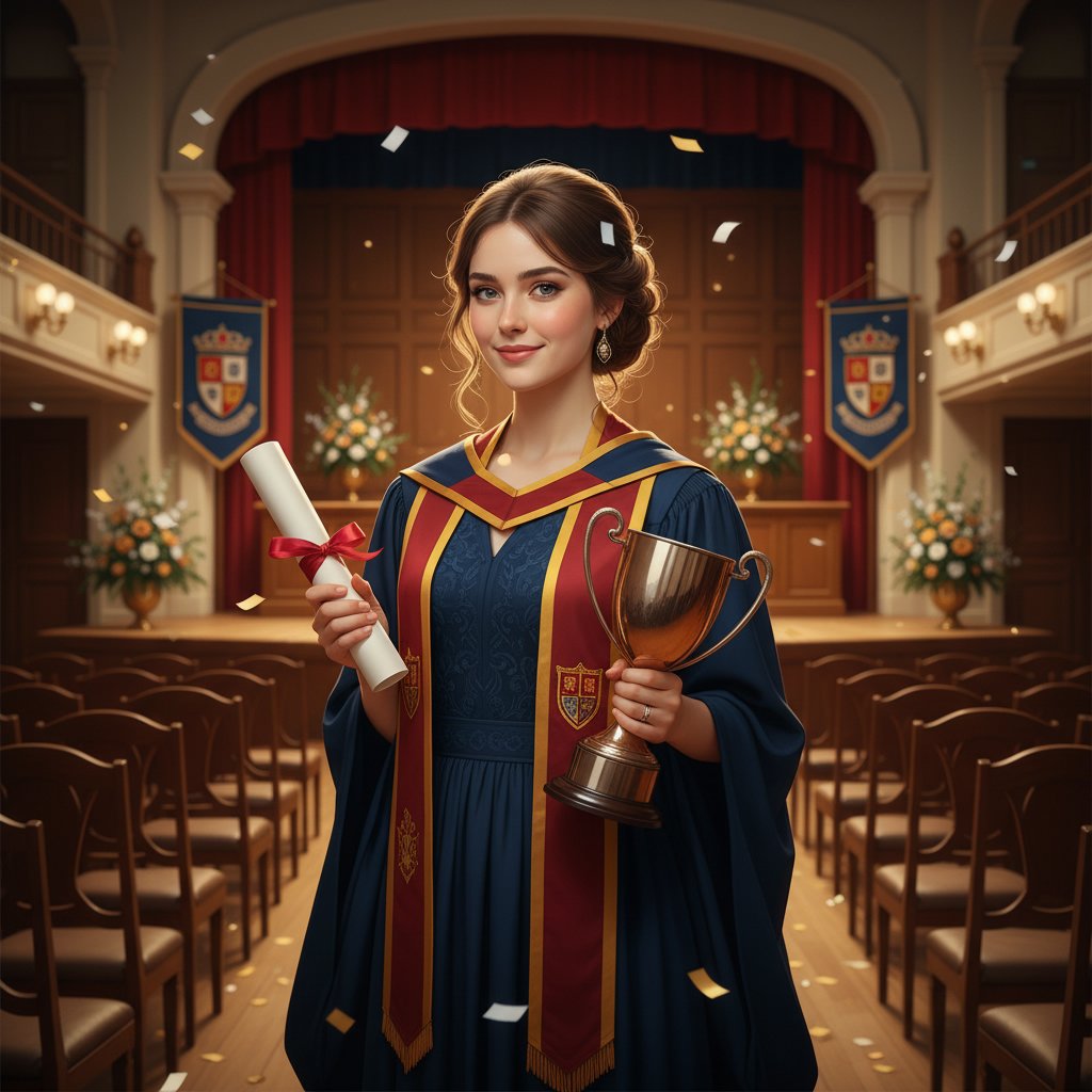Glamorous curls cascading down the shoulders, reflecting the joy and pride of academic success.
