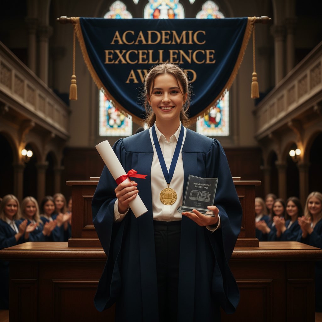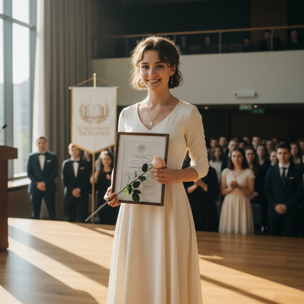 A classic low ponytail, elegantly simple, ensuring the focus remains on the scholar and their significant achievement.