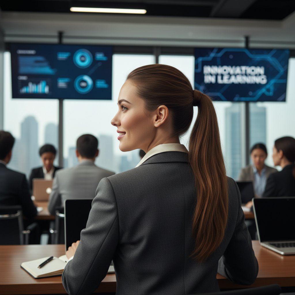 A high ponytail, sleek and polished, offers a sharp look that commands respect and attention in a seminar setting.
