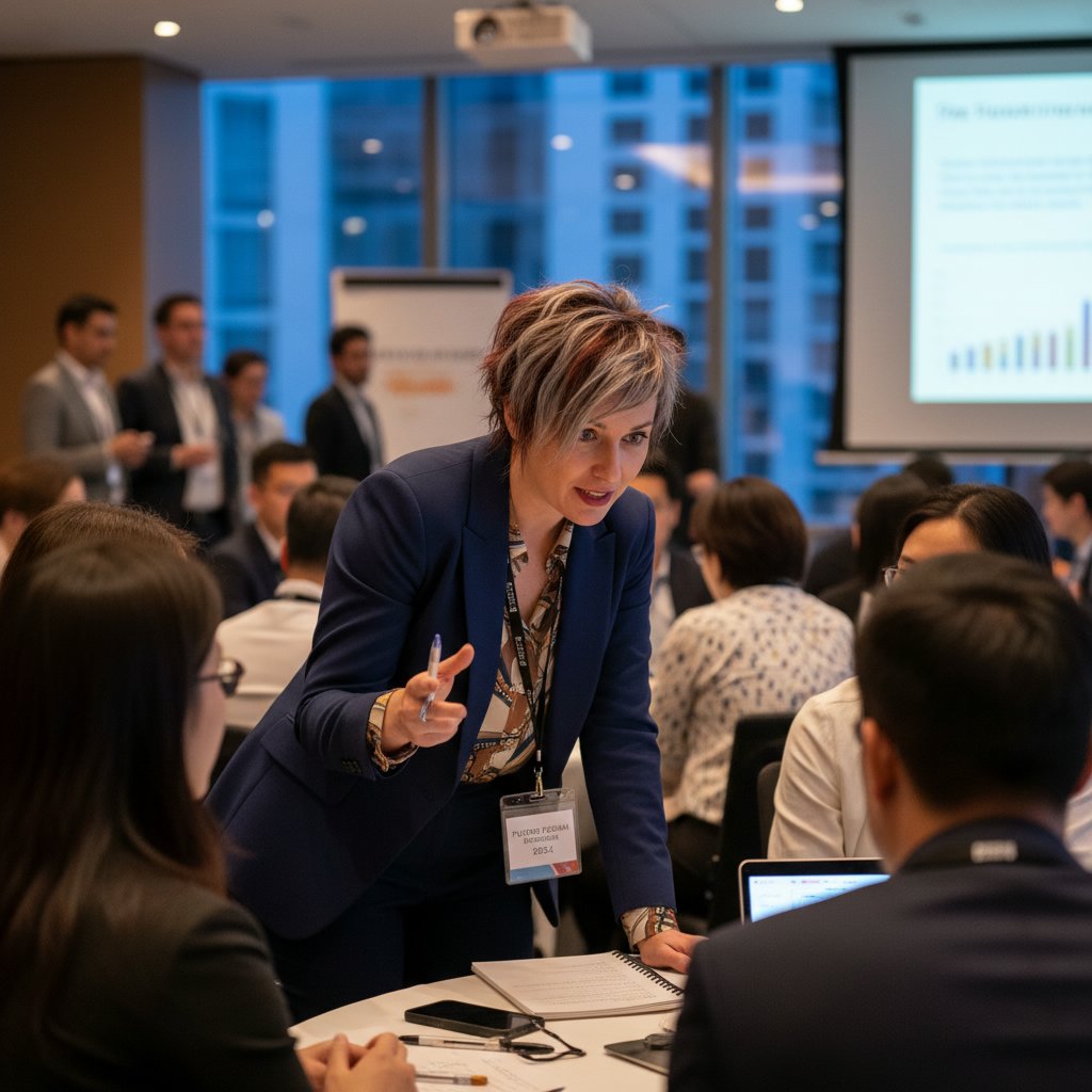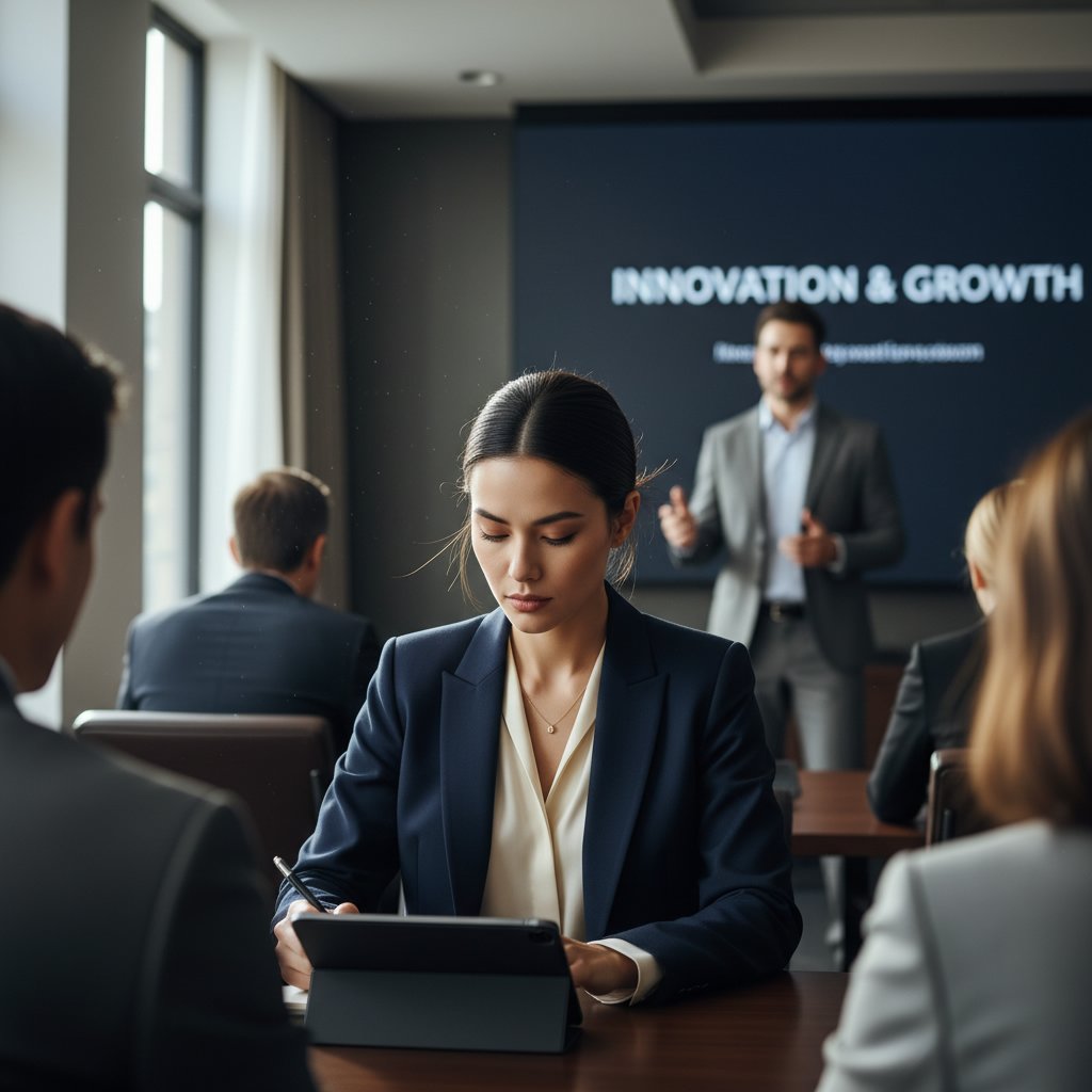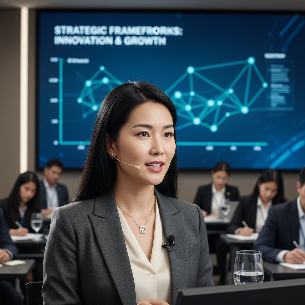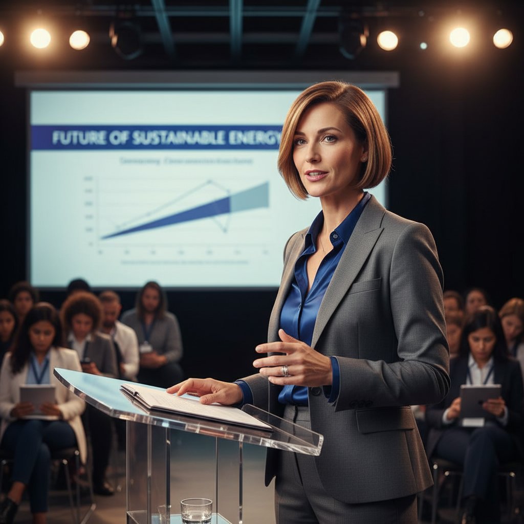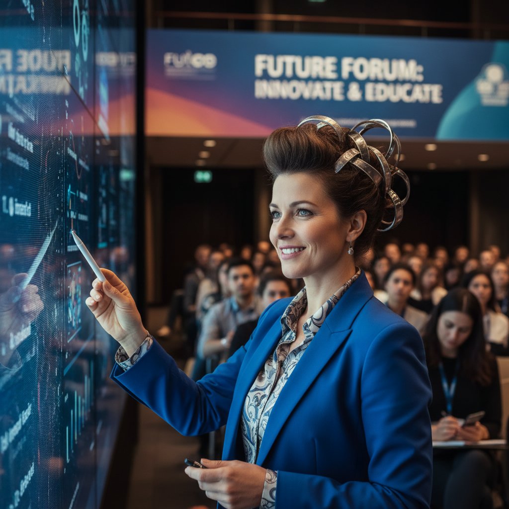An elegant chignon sits at the nape, exuding a sense of wisdom and leadership, ideal for presenters and attendees alike.