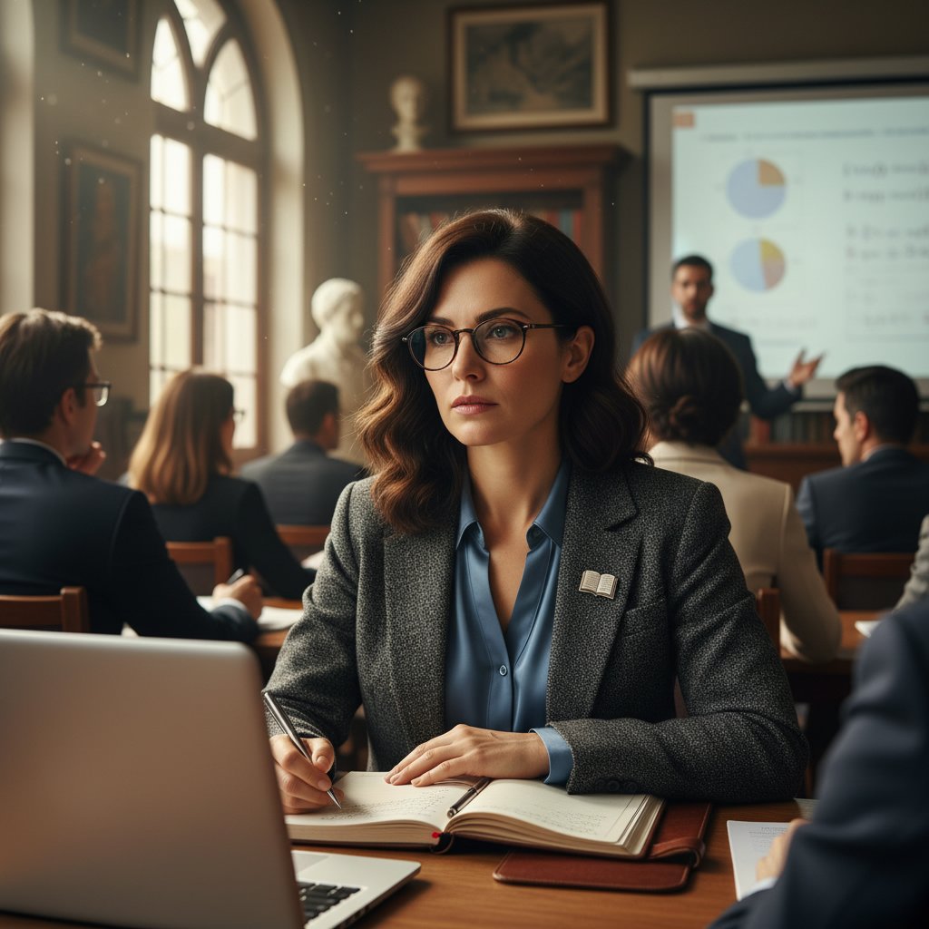 A low, minimalist bun speaks to a focus on substance over form, embodying the essence of seminar learning.