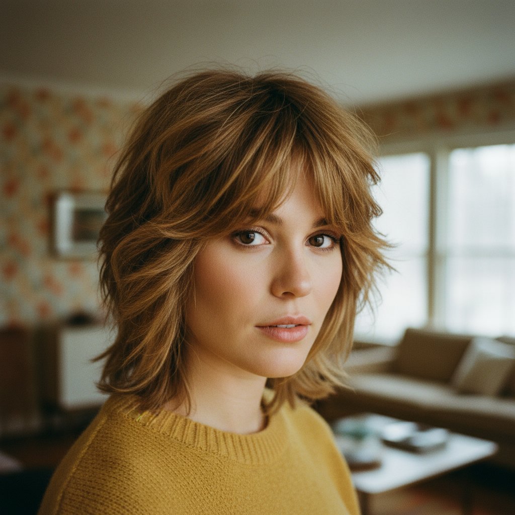 The classic shag haircut channels the spirit of the 70s rock scene, with choppy layers and feathered bangs that scream edgy chic.