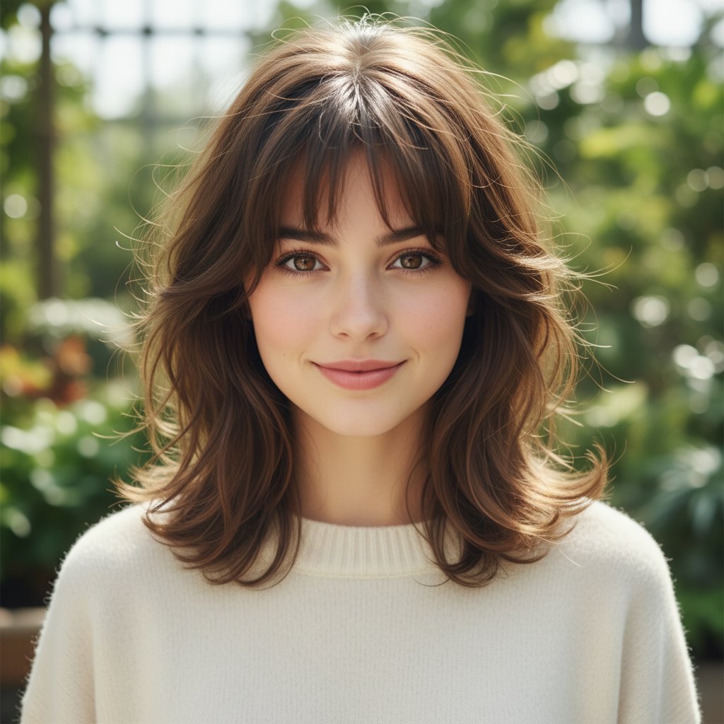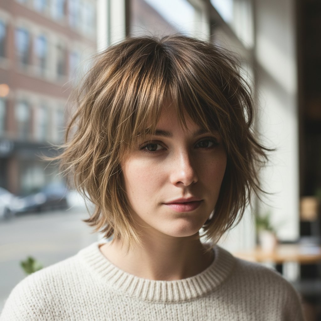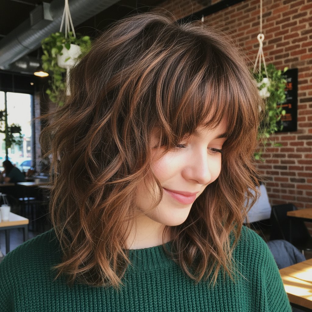 Featuring delicate, wispy bangs, this shag variant softens the face and adds a playful, youthful edge to the textured layers.