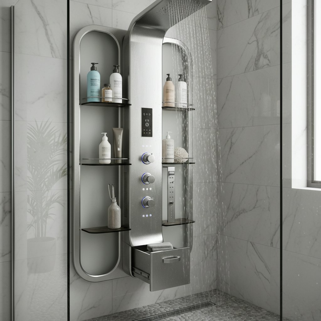 An all-in-one shampoo unit that includes storage and shelving, optimizing salon space and keeping essentials within reach.