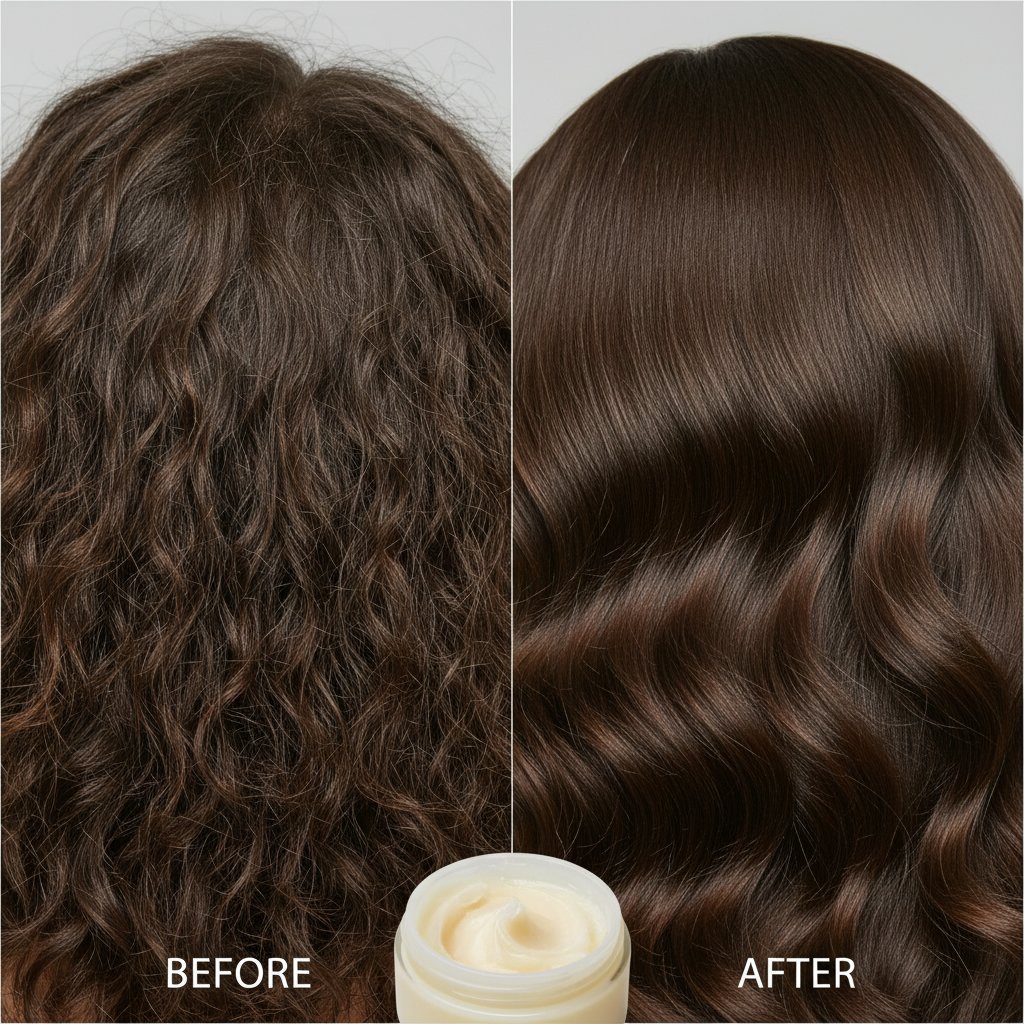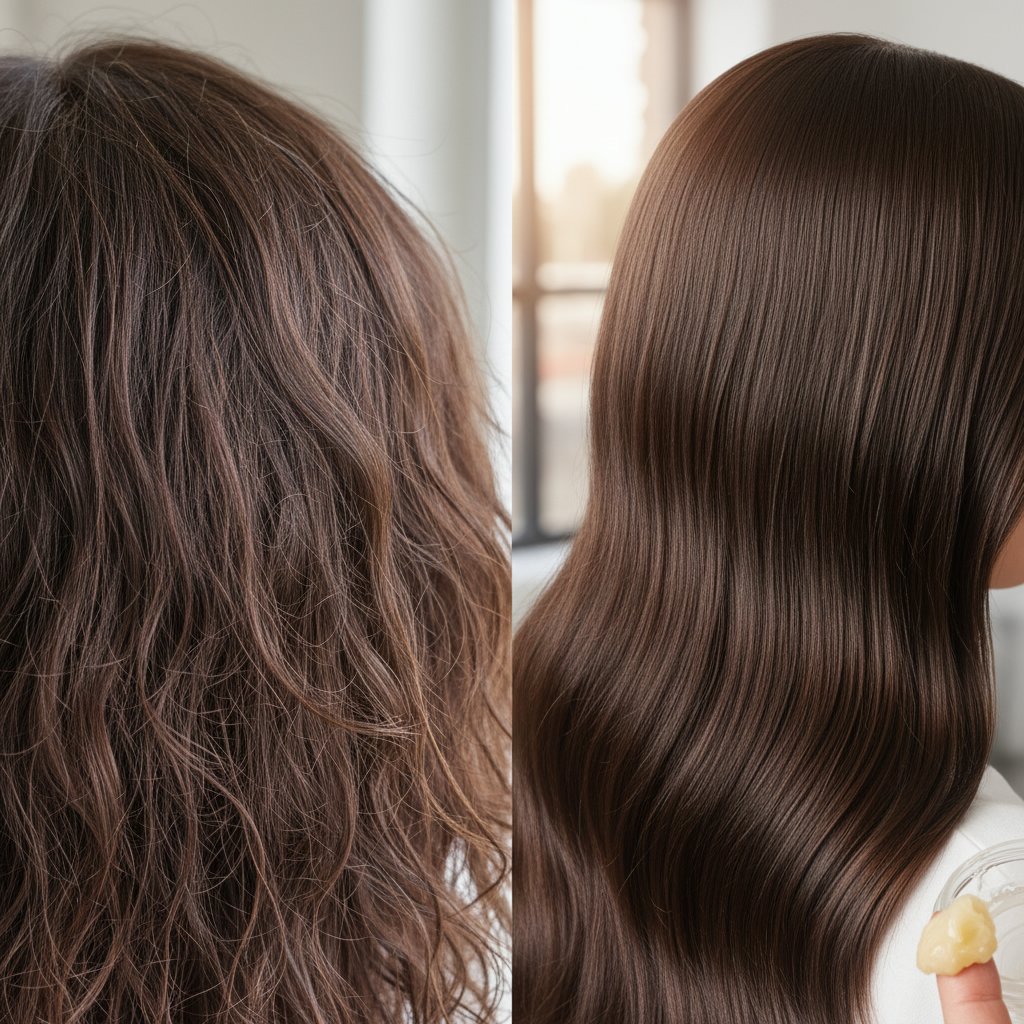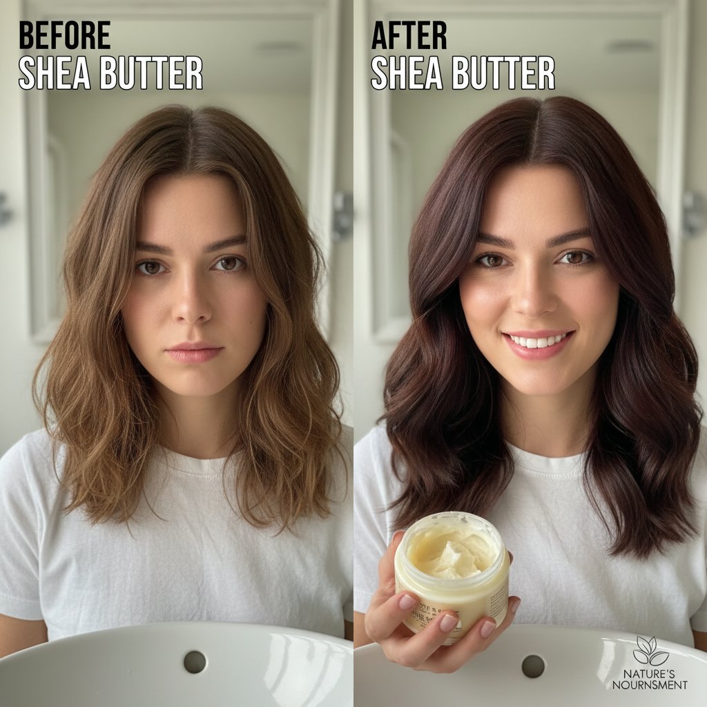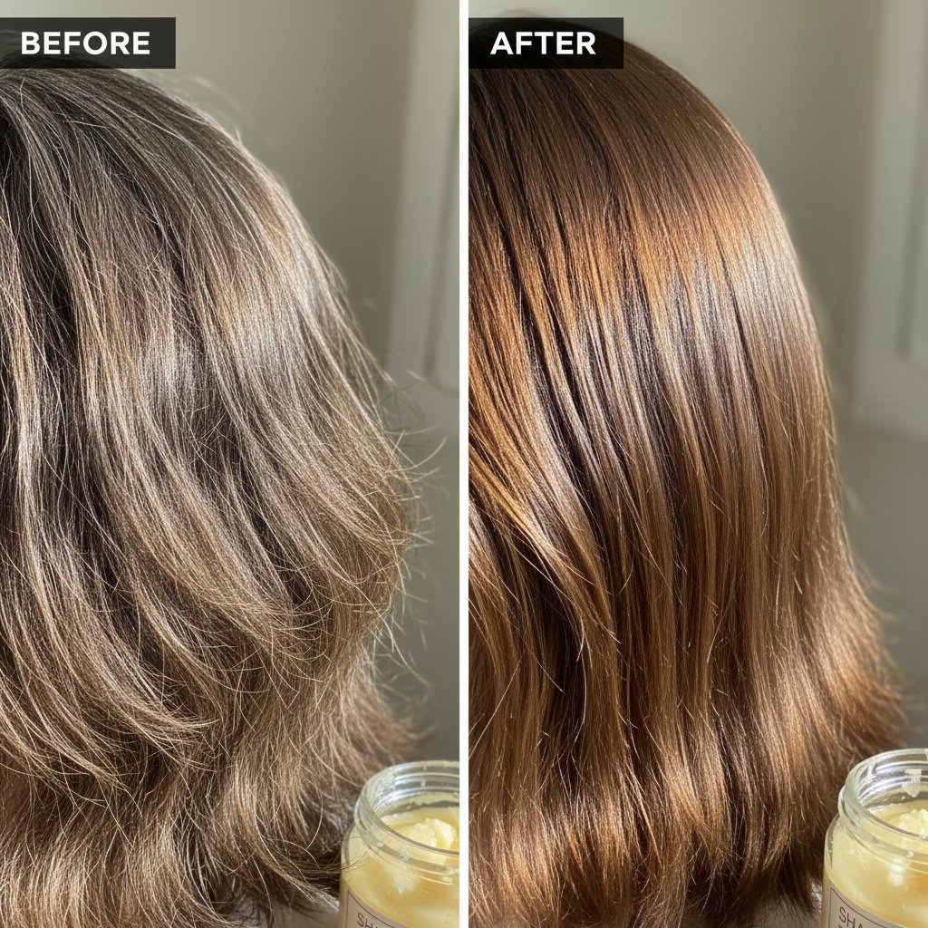 Before: Coarse, dry hair. After: Transformed into silky smooth locks, thanks to shea butter's deep moisturizing effect.