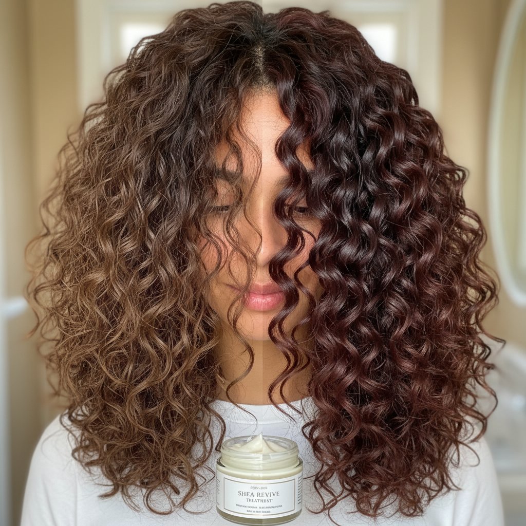 Before: Dry, lifeless curls. After: Revived curls with luscious bounce and moisture, achieved with shea butter.