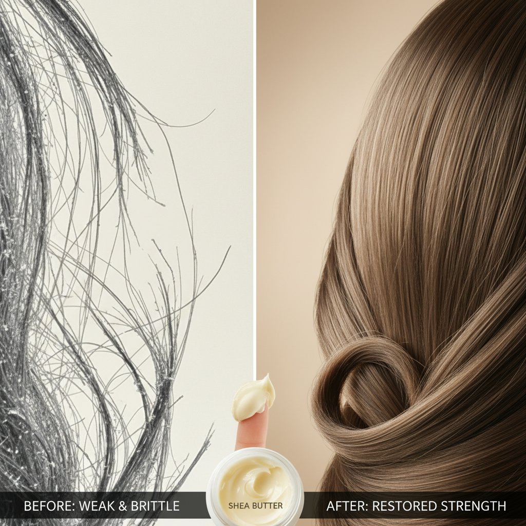Before: Weak, brittle strands. After: Restored strength and reduced breakage with consistent shea butter use.
