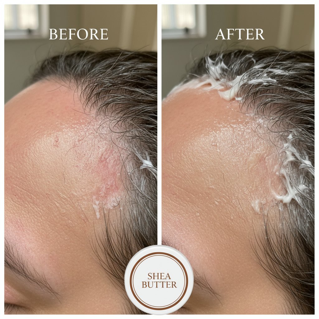 Before: Dry, itchy scalp. After: Scalp nourishment and relief from itchiness, thanks to shea butter's healing properties.