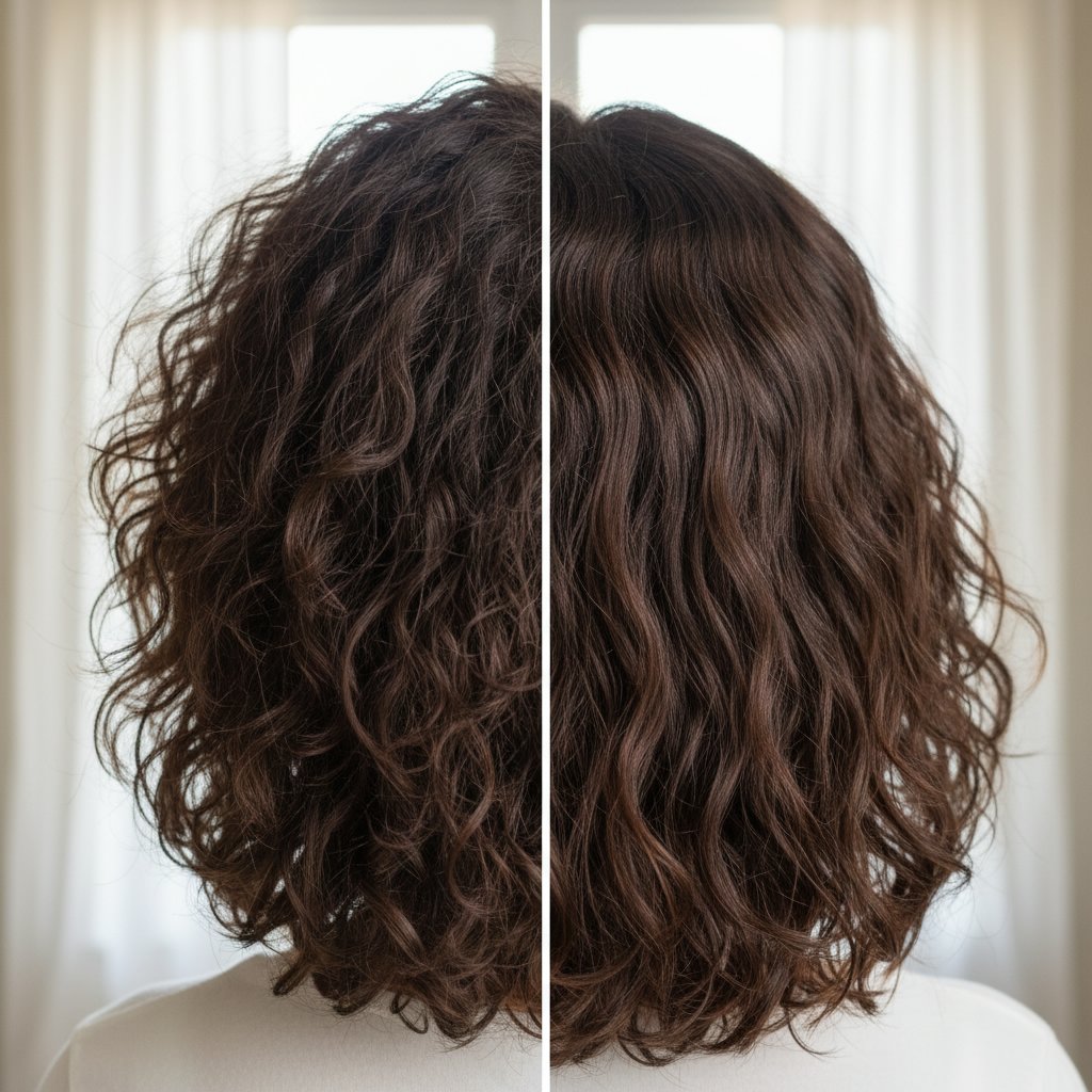 Before: Frizzy, undefined curls. After: Enhanced curl definition and reduced frizz, courtesy of shea butter.