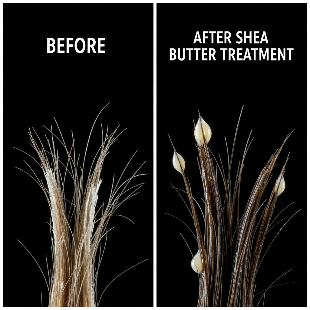 Before: Dry, split ends. After: Moisture-sealed ends, preventing further splits with shea butter's protective layer.
