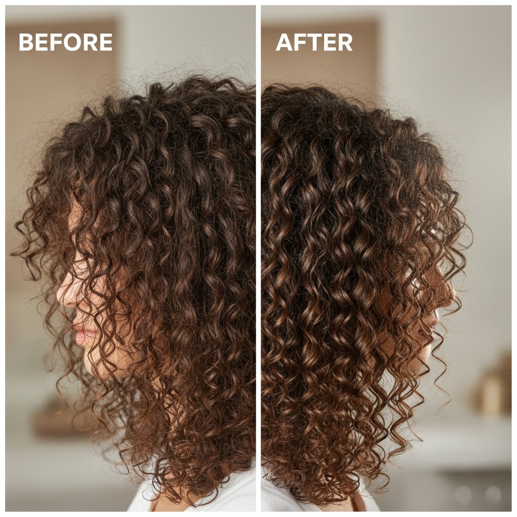 Before: Frizzy, undefined curls. After: Perfectly defined curls with a brilliant shine, thanks to a light mist of shine spray.