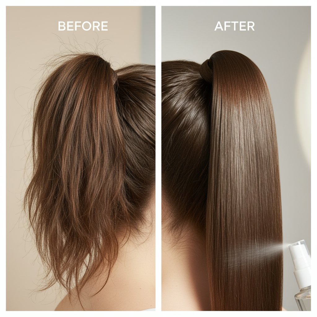 Before: A matte, everyday ponytail. After: A sleek, polished ponytail that glistens under the light, elevated with shine spray.