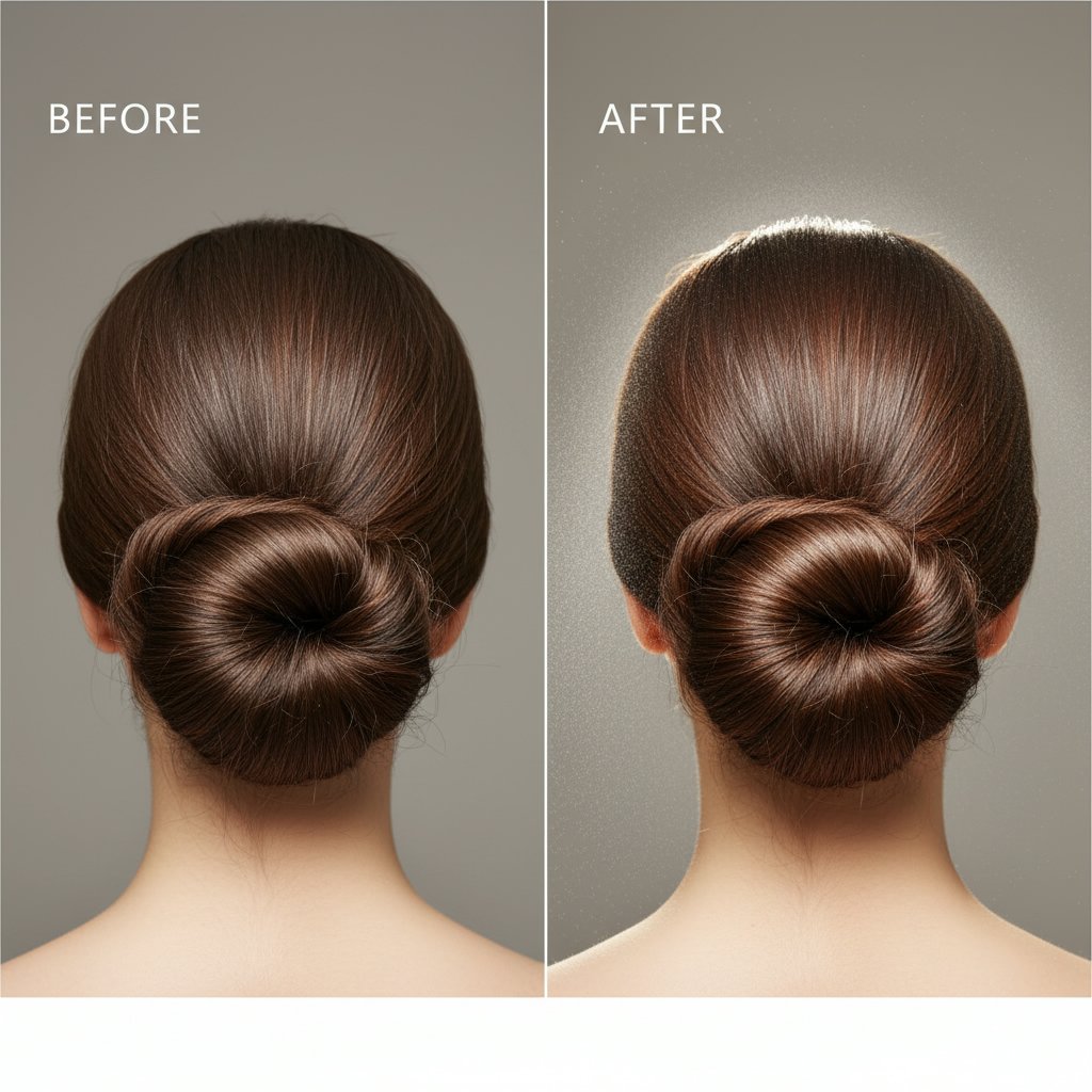 Before: A simple, flat updo. After: An exquisite, lustrous updo that shines from every angle, thanks to generous use of shine spray.