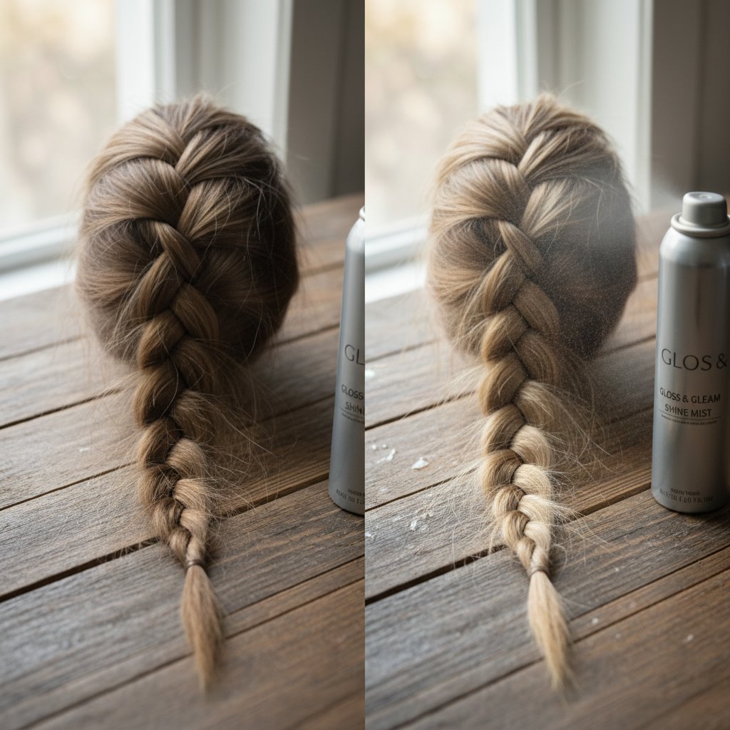 Before: A basic, dull braid. After: A captivating, brilliantly shiny braid, with each strand catching the light, achieved with shine spray.
