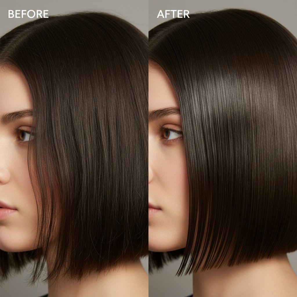 Before: Dull and unremarkable. After: A radiant, silky straight style enhanced with shine spray for a mirror-like finish.