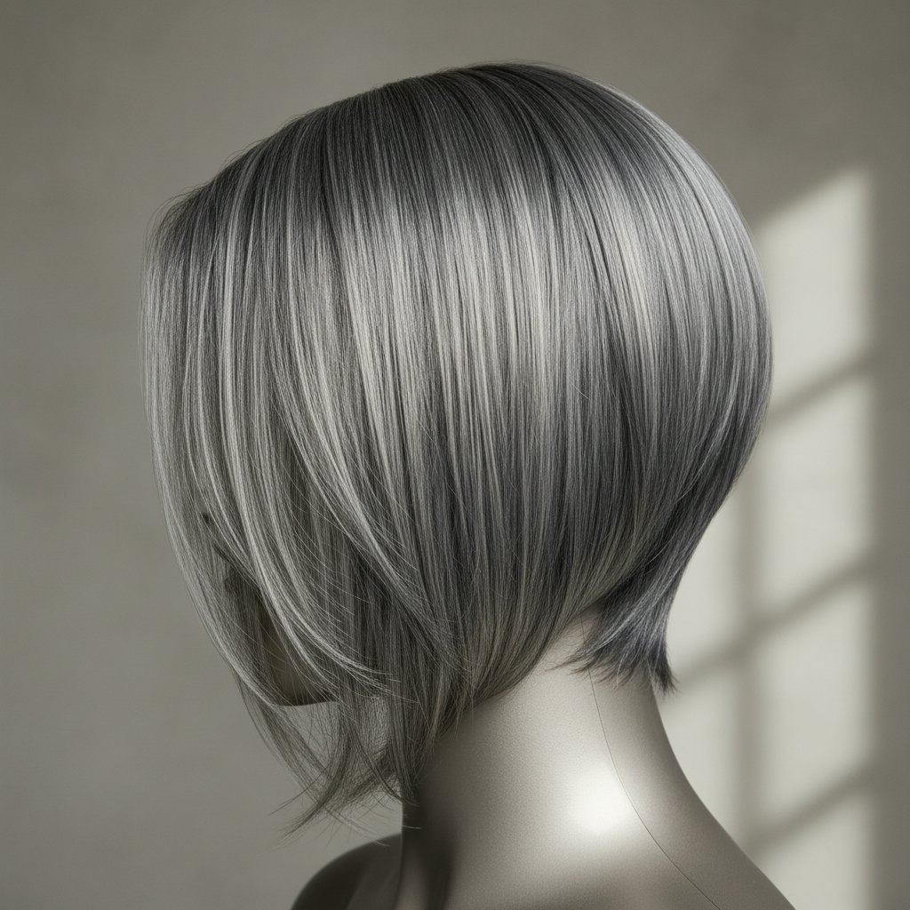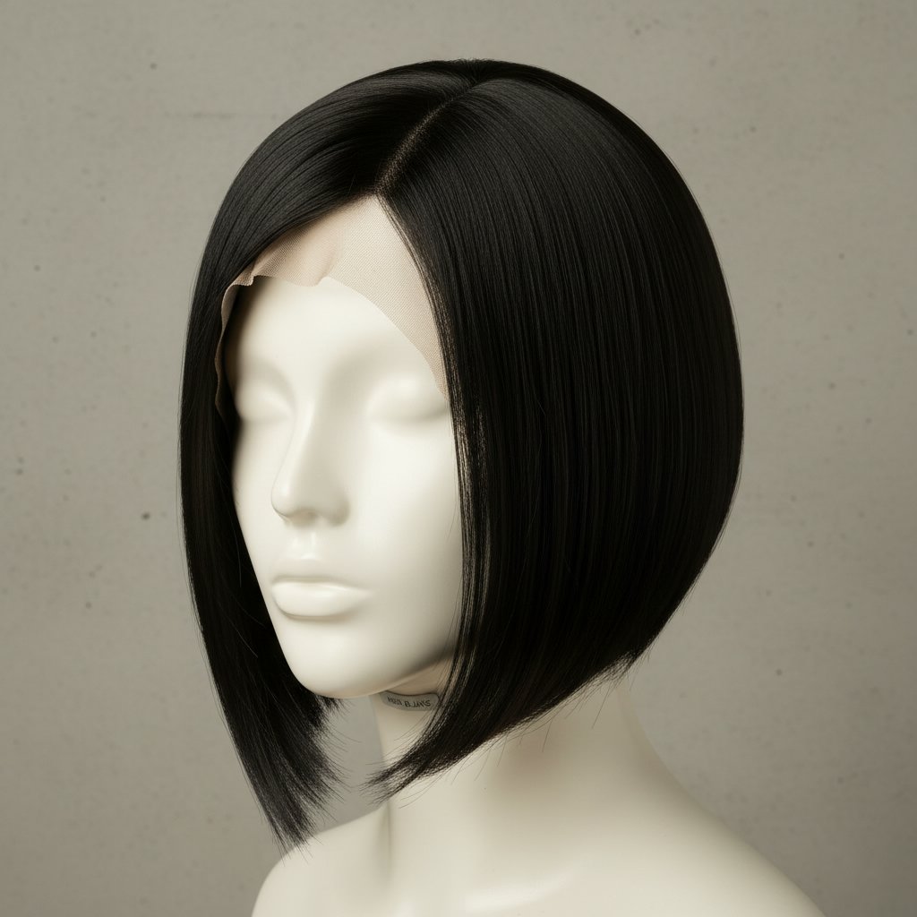 An angled bob wig showcases sophistication with its asymmetrical cut, providing a contemporary twist on the classic bob style.