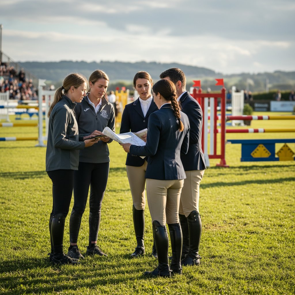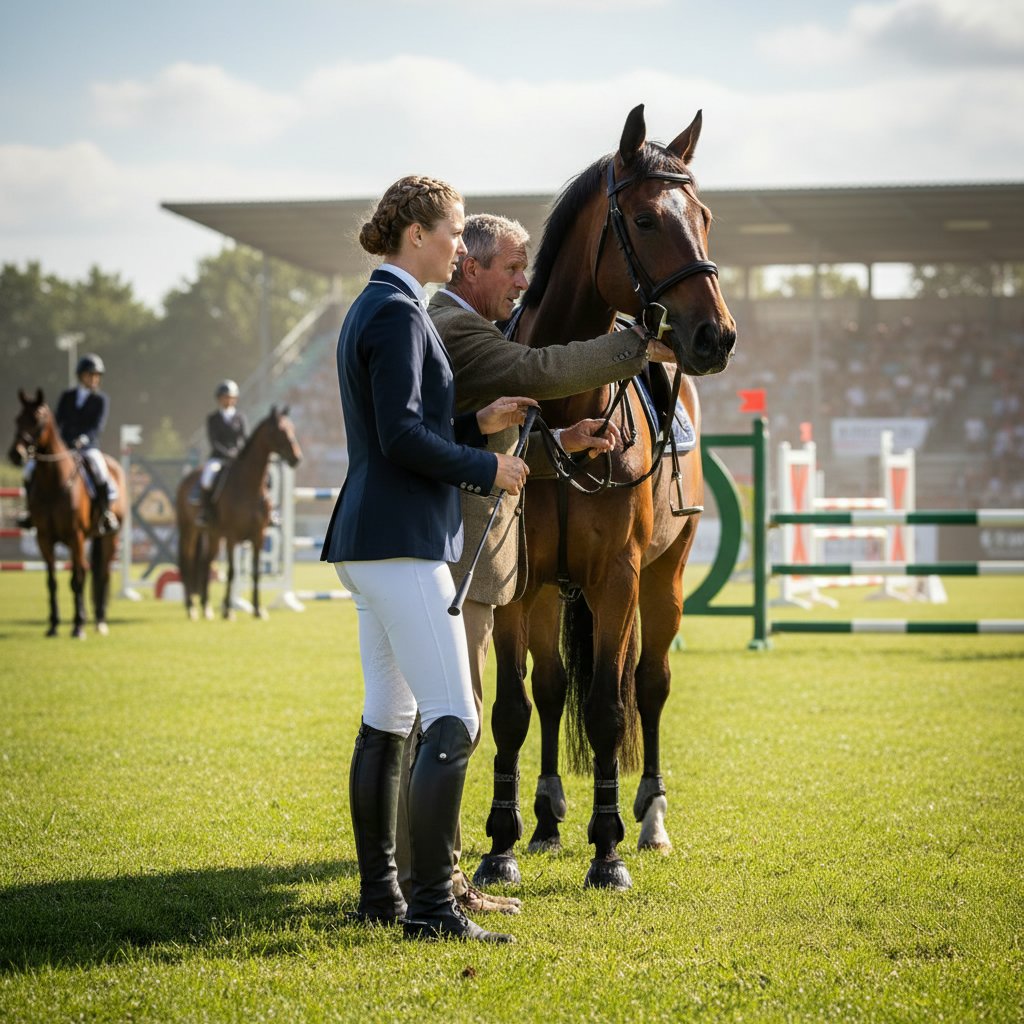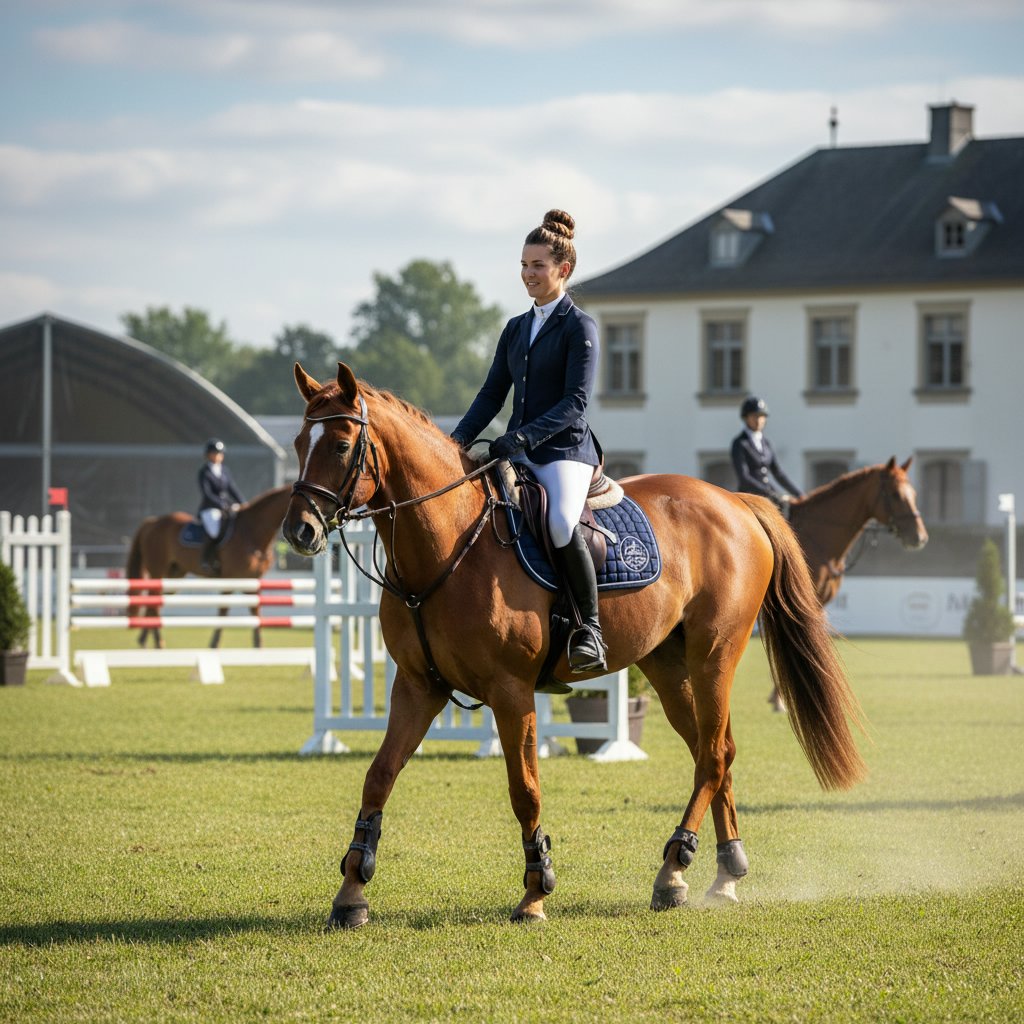 A crown braid circles the head, offering a regal and secure hairstyle that complements the show jumping helmet.