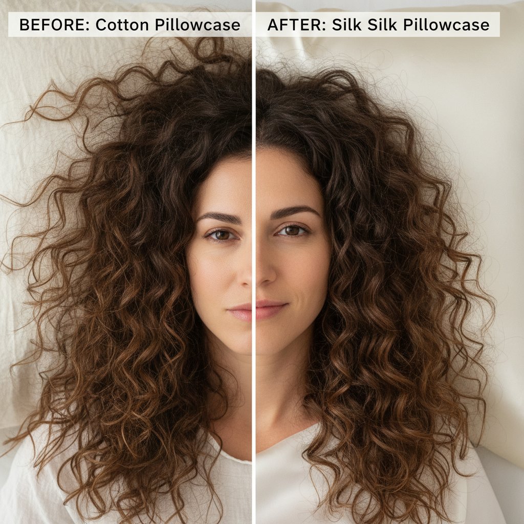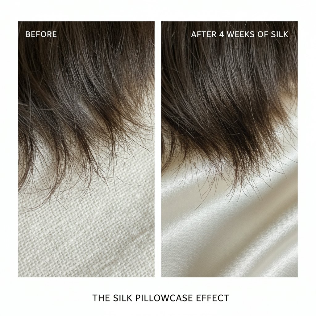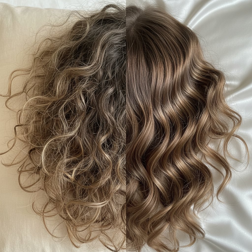 Before: Pronounced frizz and breakage from cotton pillowcases. After: Noticeable reduction in frizz and breakage with silk pillowcases.