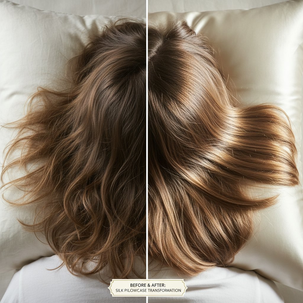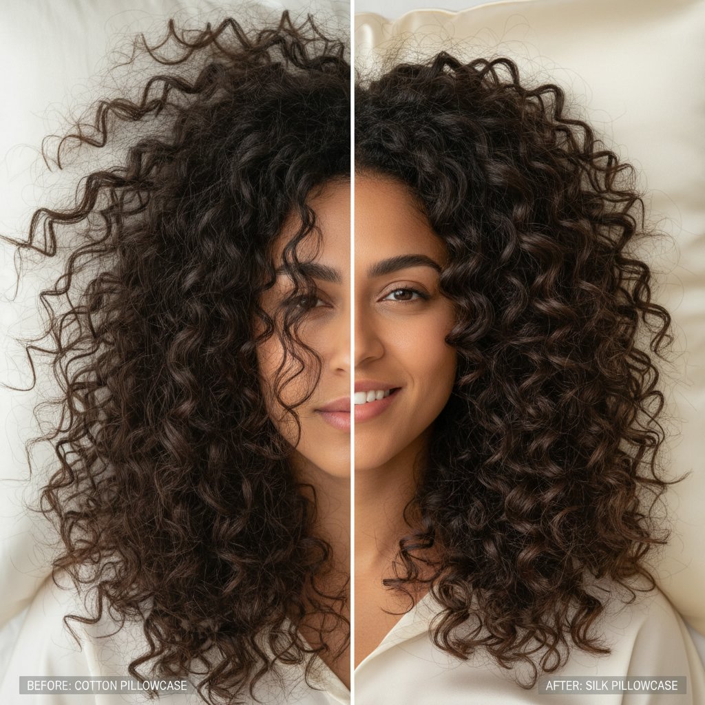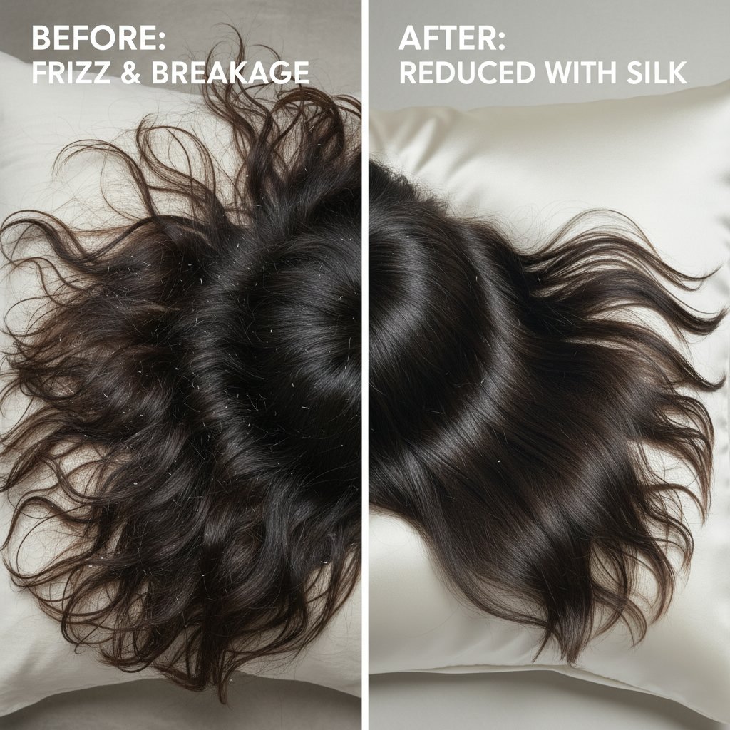 Before: Pronounced frizz and breakage from cotton pillowcases. After: Noticeable reduction in frizz and breakage with silk pillowcases.