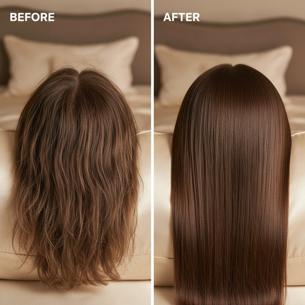 Before: Overall poor hair condition from cotton pillowcases. After: Comprehensive hair protection and improvement with silk pillowcases.