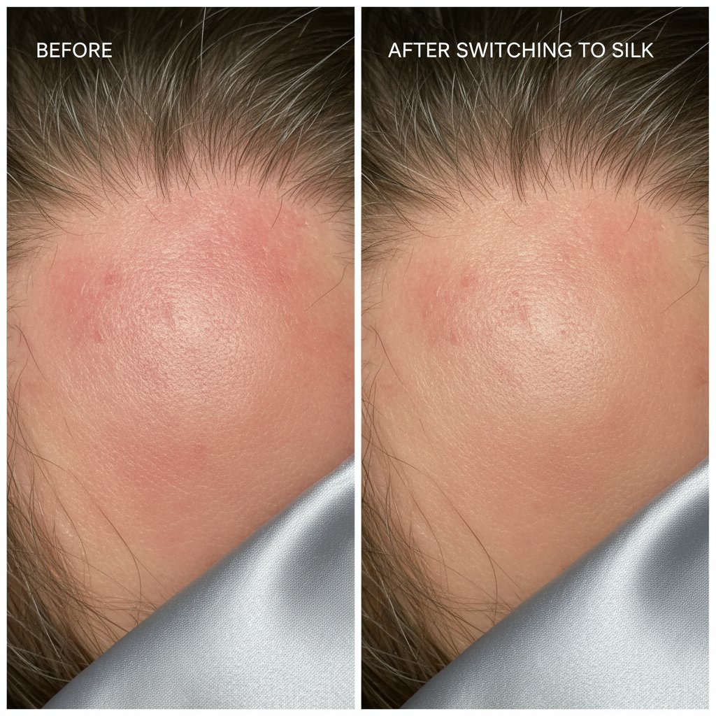 Before: Scalp irritation from abrasive bedding. After: Soothed scalp, benefiting from silk's hypoallergenic properties.