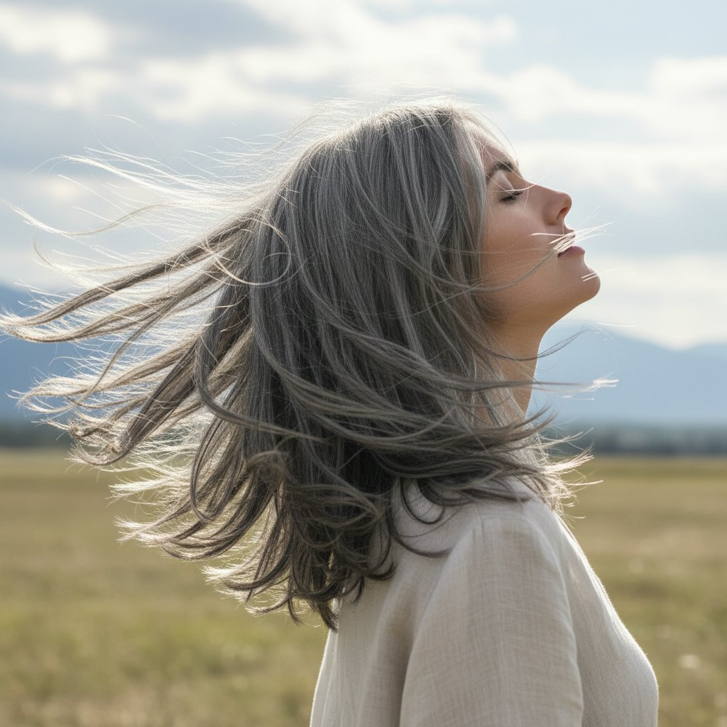 Stormy grey layers are cut to perfection, adding movement and intrigue to the hair, perfect for those seeking depth without darkness.