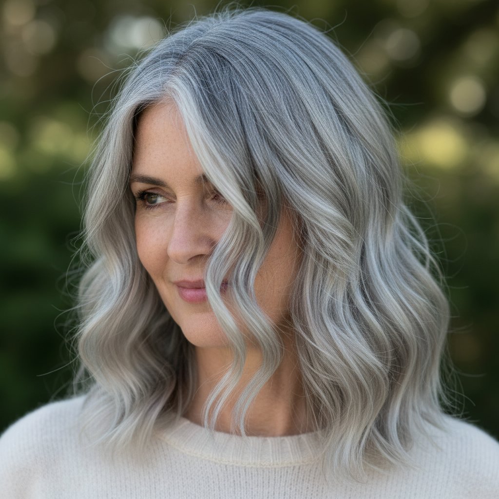 A masterful blend of silvery grey tones creates a balayage effect that adds depth and texture, embodying sophisticated grace.