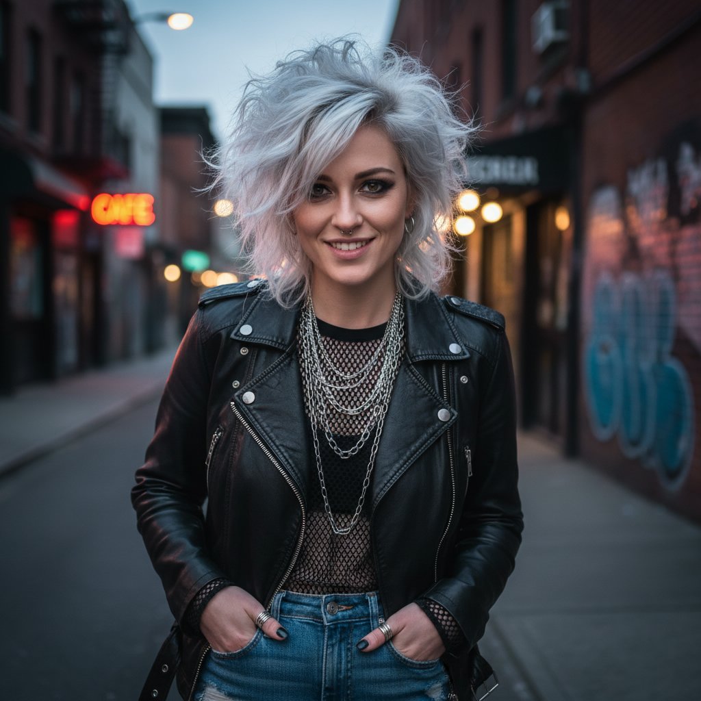 This platinum silver pixie cut mixes playfulness with edginess, creating a dynamic style that's both modern and timeless.