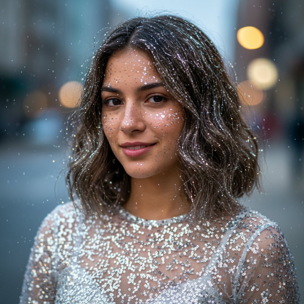 Shimmering silver highlights weave through darker hair, creating a magical, sparkling effect that catches the eye.