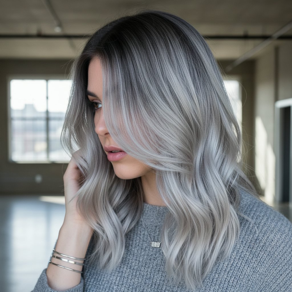 Dusty silver ombre fades from dark roots to light tips, offering a soft, seamless transition that embodies modern sophistication.
