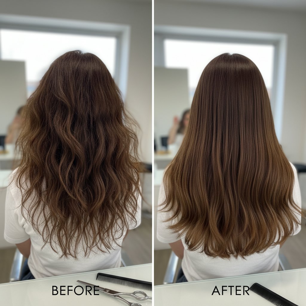 A precise trim can be the first step to health, as shown in this before-and-after, illustrating the immediate improvement in hair appearance.