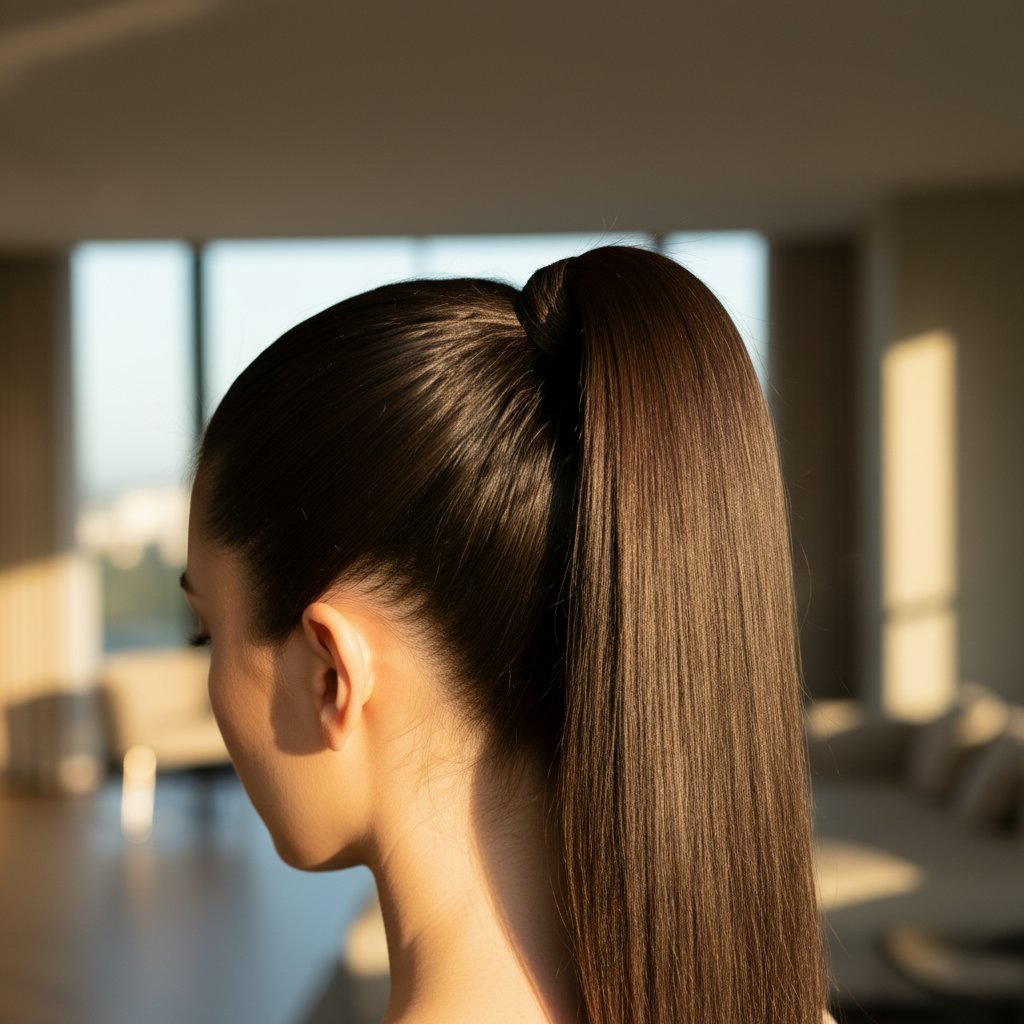 A sleek high ponytail, perfectly smooth and secured at the crown, offers an elegant, polished look ideal for both day and night.