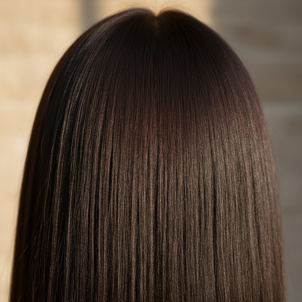 A pin-straight style with a center part exemplifies minimalist beauty, highlighting the hair's natural shine and smooth texture.