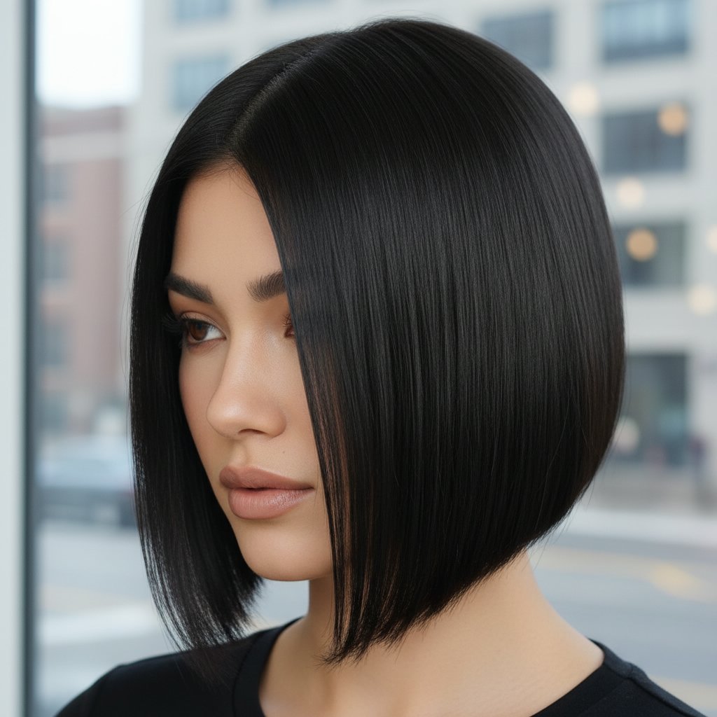 The sleek angled lob, slightly longer at the front, contours the face perfectly, offering a modern twist on a classic style.