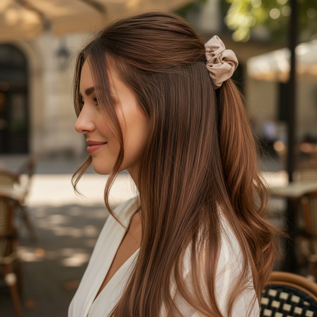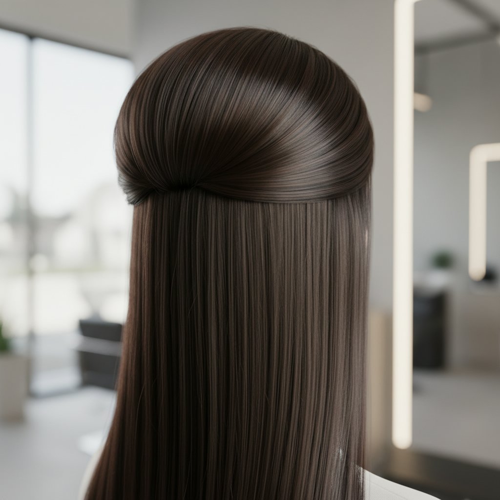 This half-up, half-down style combines the ease of an updo with the graceful flow of straight hair, achieving a look of understated elegance.