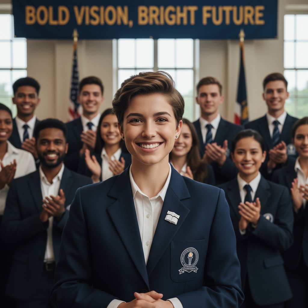 A bold angular bob that makes a statement, showcasing the innovative and dynamic spirit of the student leader.