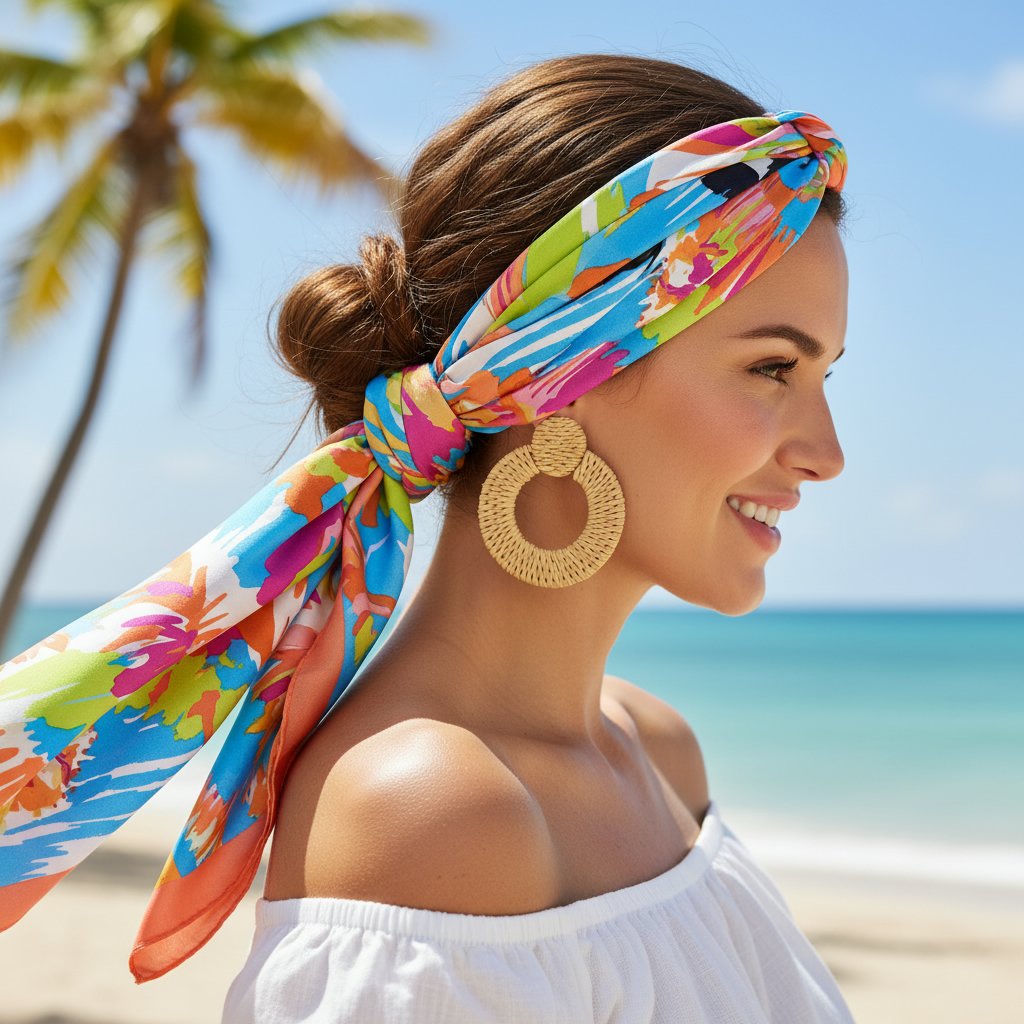 A low bun accented with a colorful scarf provides a chic and functional style, keeping your hair neat and adding a pop of summer color.
