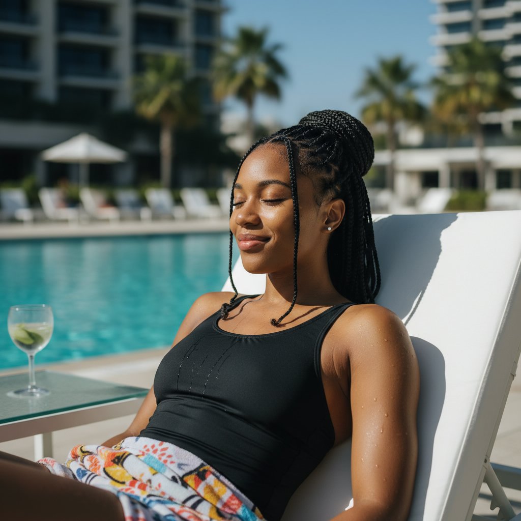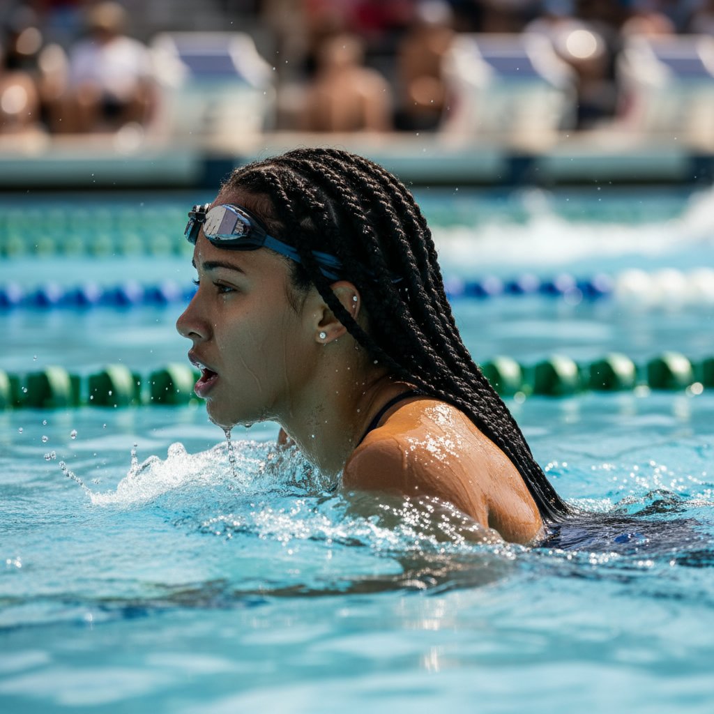 A hairstyle designed to fit snugly under a swim cap, reducing drag and protecting hair from chlorine, showcasing the swimmer's streamlined silhouette.